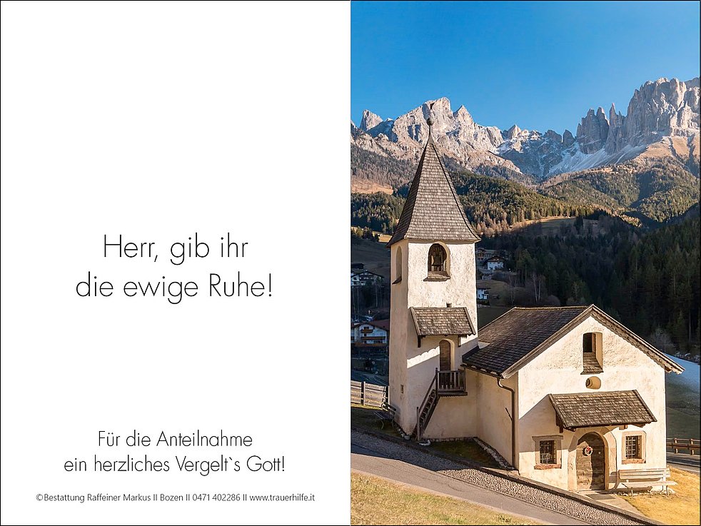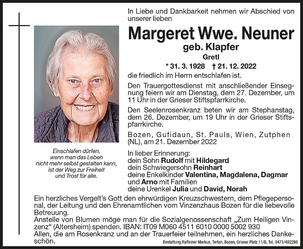 Anstelle von Blumen, möge man für die Sozialgenossenschaft „Zum Heiligen Vinzenz“ (Altersheim) spenden. IBAN: IT09 M060 4511 6010 0000 5002 930