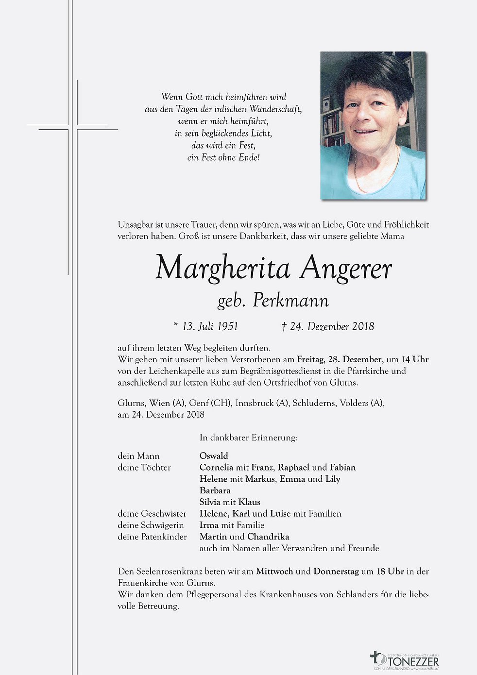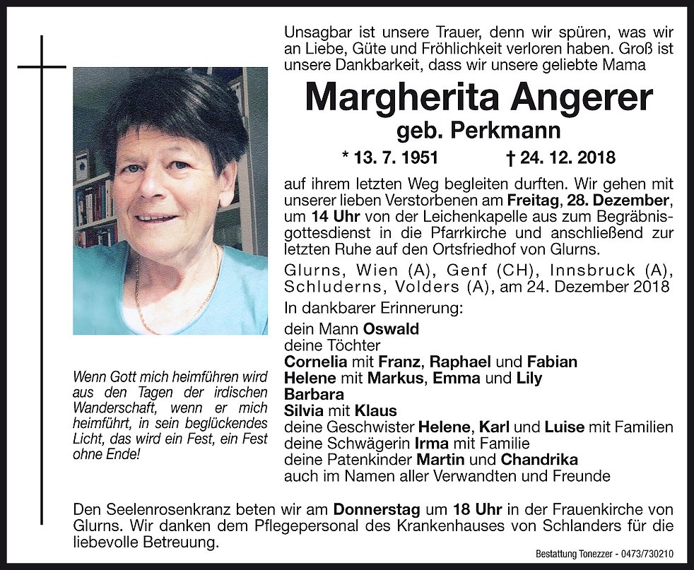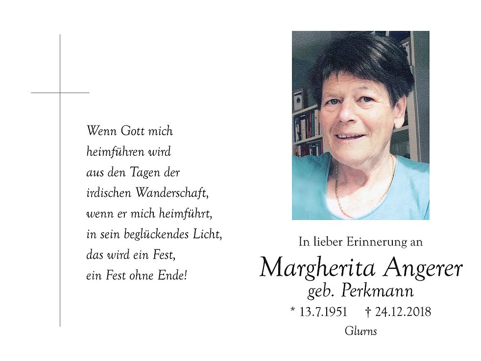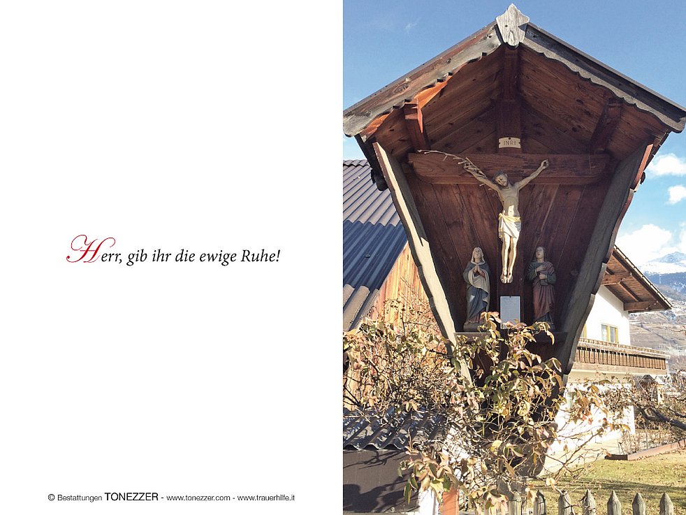 Wir gehen mit unserer lieben Verstorbenen am Freitag, 28. Dezember, um 14 Uhr von der Leichenkapelle aus zum Begräbnisgottesdienst in die Pfarrkirche und anschließend zur letzten Ruhe auf den Ortsfriedhof von Glurns.