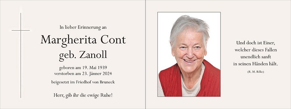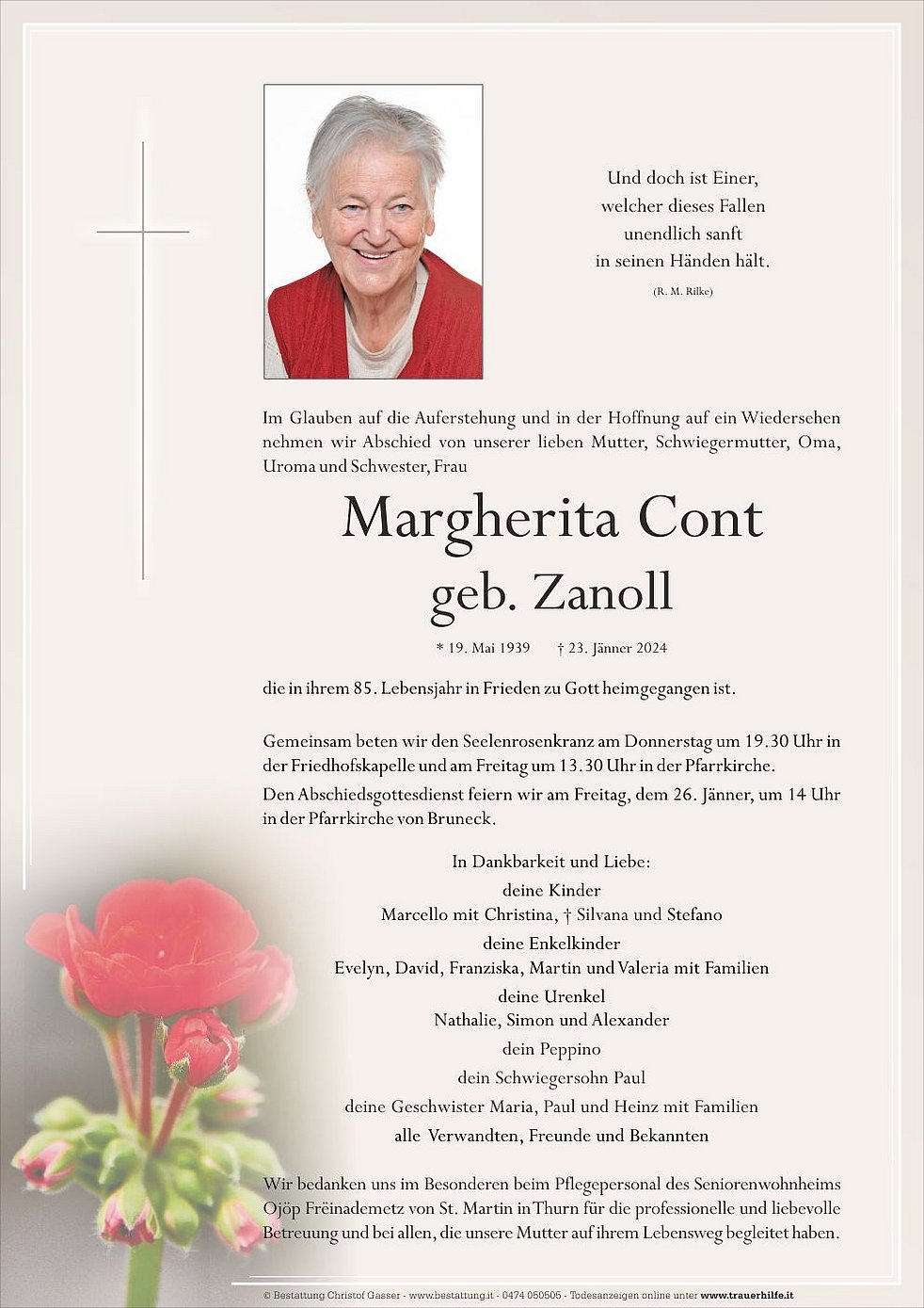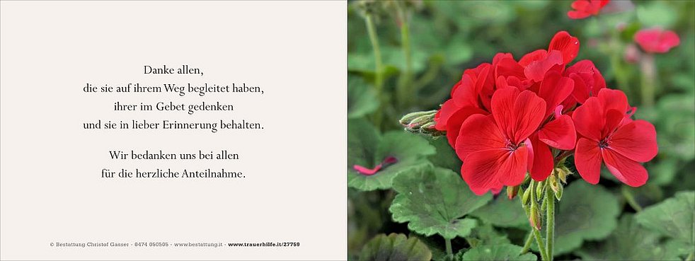 Wir bedanken uns im Besonderen beim Pflegepersonal des Seniorenwohnheims Ojöp Frëinademetz von St. Martin in Thurn für die professionelle und liebevolle Betreuung und bei allen, die unsere Mutter auf ihrem Lebensweg begleitet haben.
