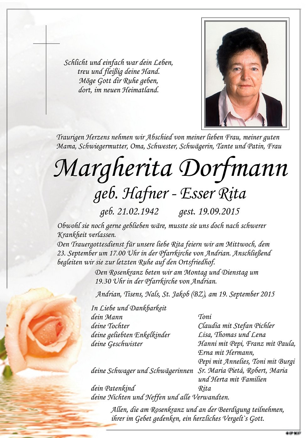 Den Trauergottesdienst für unsere liebe Rita feiern wir am Mittwoch, dem