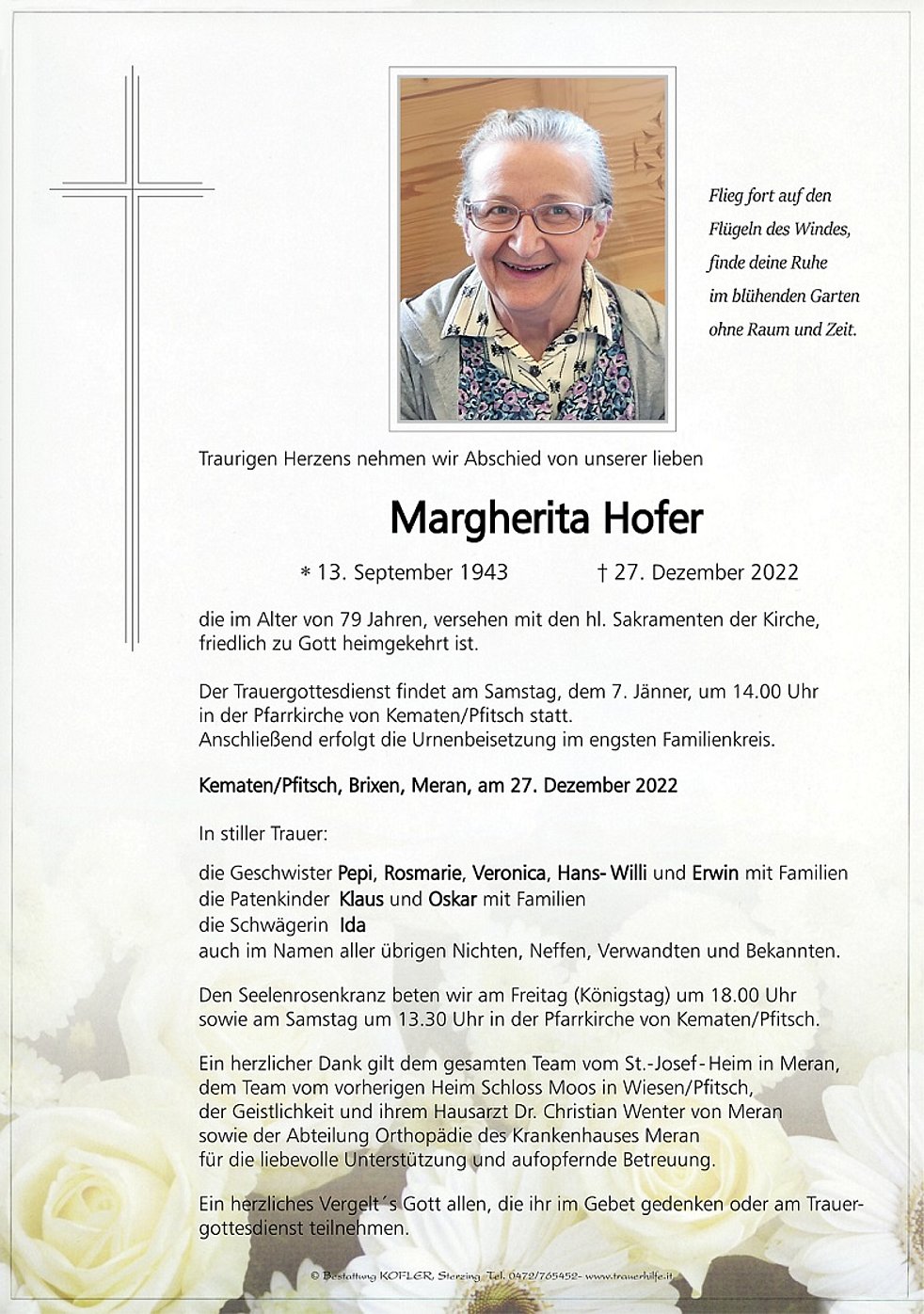 Der Trauergottesdienst findet am Samstag, dem 7. Jänner, um 14.00 Uhr in der Pfarrkirche von Kematen/Pfitsch statt. Anschließend erfolgt die Urnenbeisetzung im engsten Familienkreis.