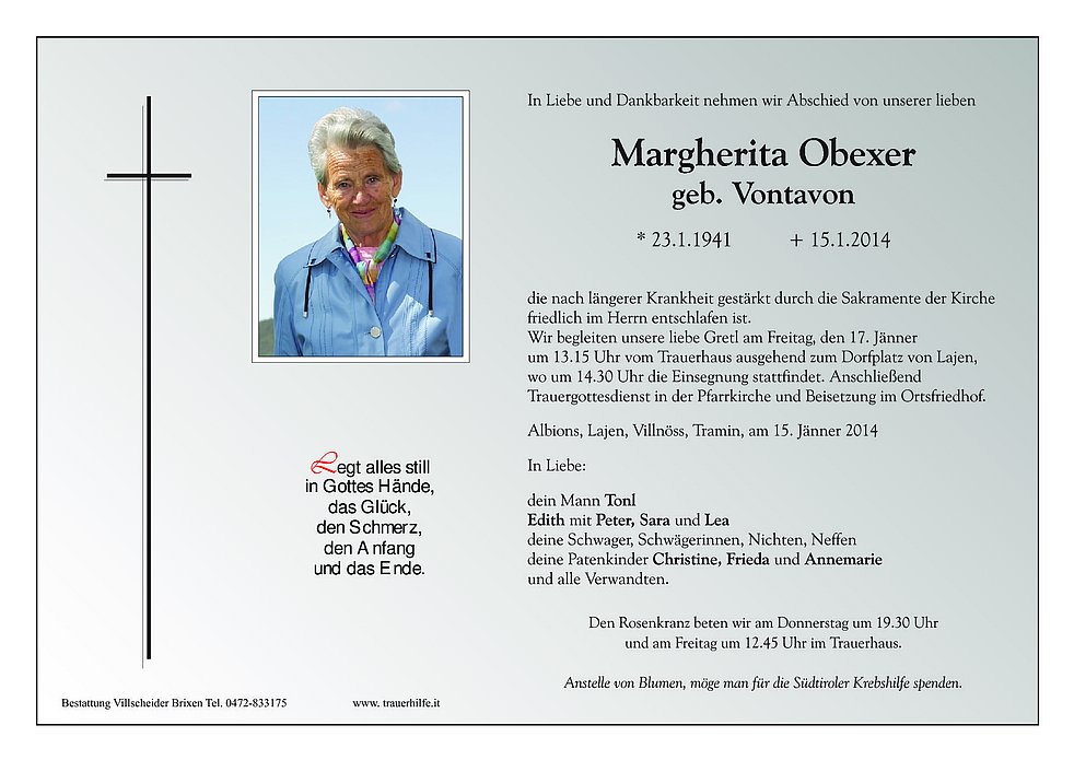 Anstelle von Blumen, möge man für die Südtiroler Krebshilfe spenden.