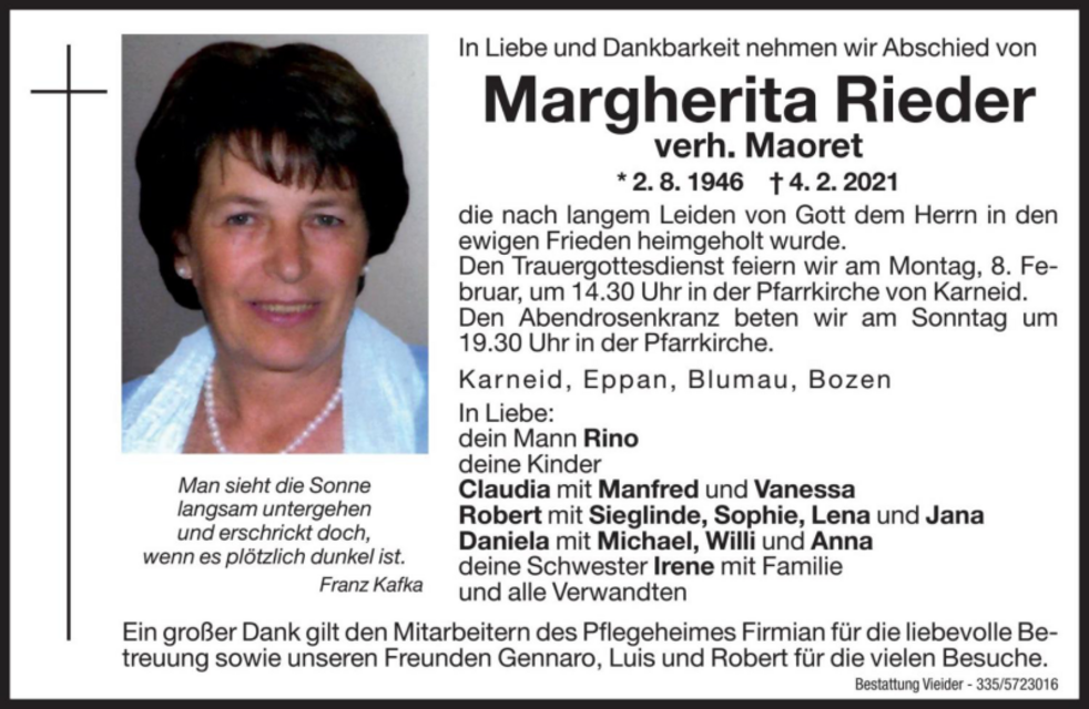 Den Trauergottesdienst feiern wir am Montag, 8. Februar um 14.30 Uhr in der Pfarrkirche von Karneid .