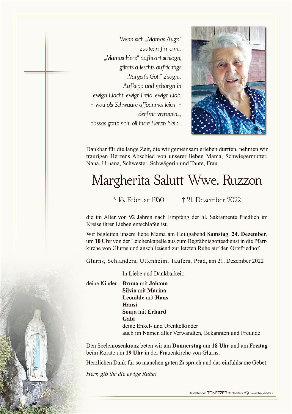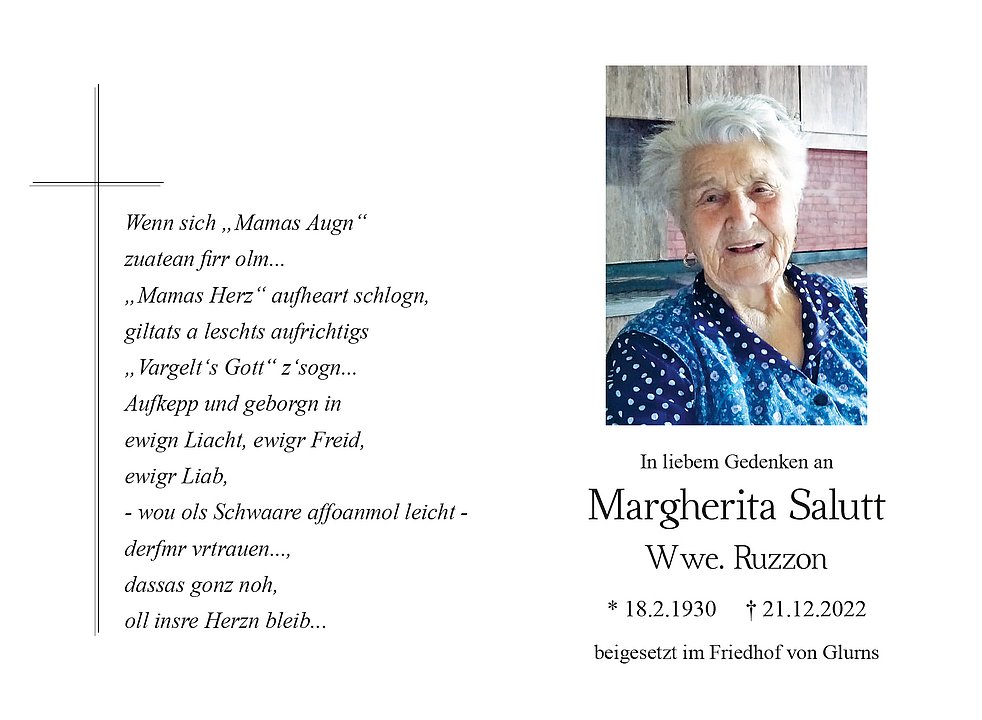 Wir begleiten unsere liebe Mama am Heiligabend Samstag, 24. Dezember, um 10 Uhr von der Leichenkapelle aus zum Begräbnisgottesdienst in die Pfarrkirche von Glurns und anschließend zur letzten Ruhe auf den Ortsfriedhof.