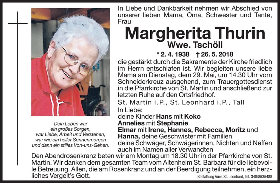 Wir begleiten unsere liebe Mama am Dienstag, dem 29. Mai, um 14.30 Uhr vom Schneiderkreuz ausgehend, zum Trauergottesdienst in die Pfarrkirche von St. Martin und anschließend zur letzten Ruhe auf den Ortsfriedhof.