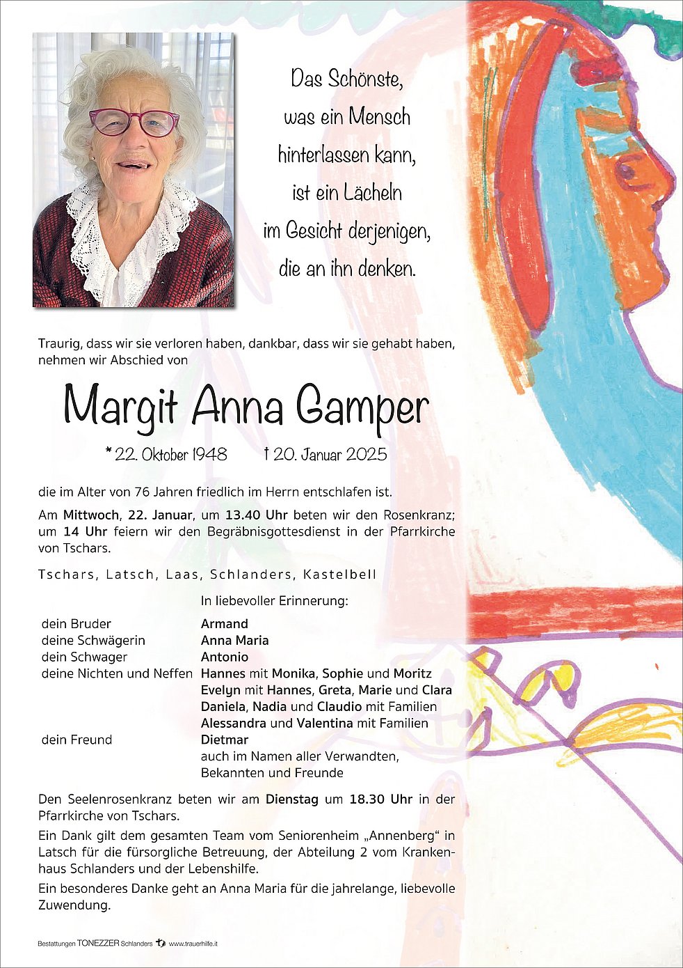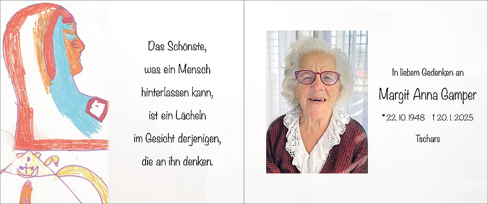 Margit war jahrzehntelang stets eine fleißige, humorvolle und sehr geschätzte Mitarbeiterin der Nähgruppe in der Werkstatt der Lebenshilfe in Schlanders. Wir sind sehr dankbar, dass wir Margit auf ihrem Lebensweg ein Stück weit begleiten durften.