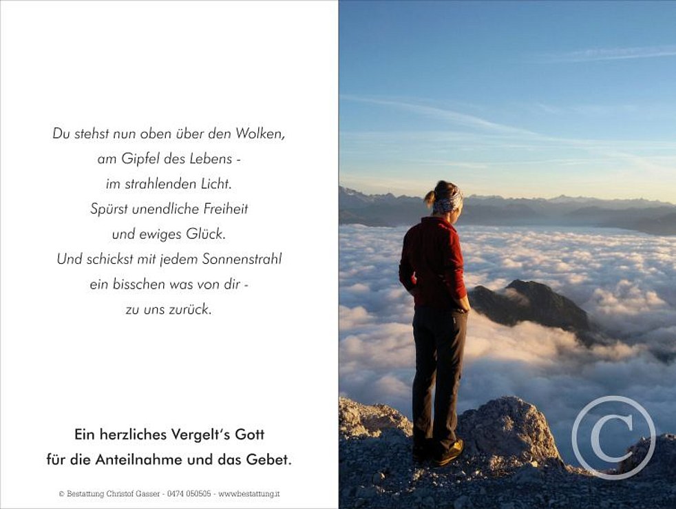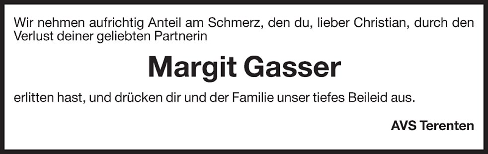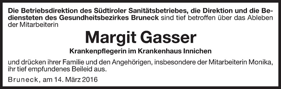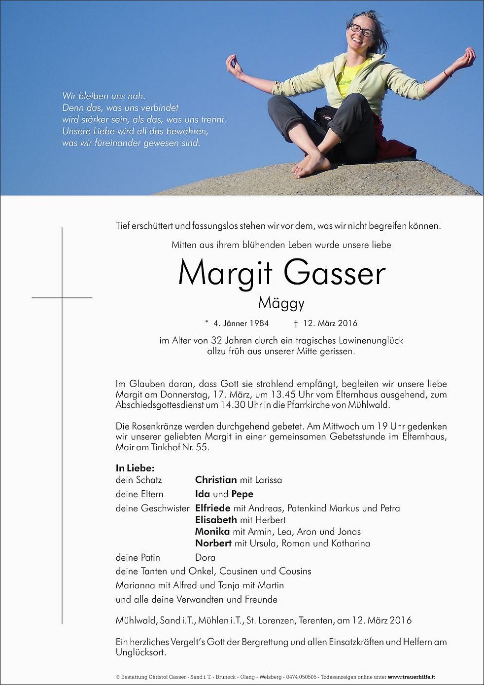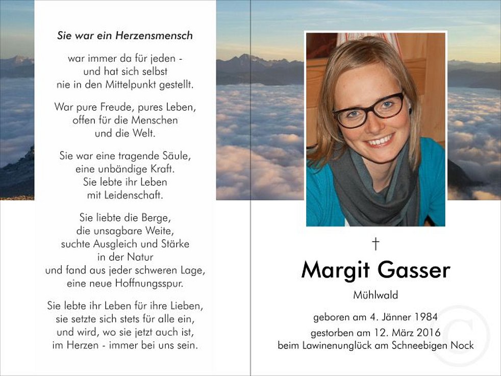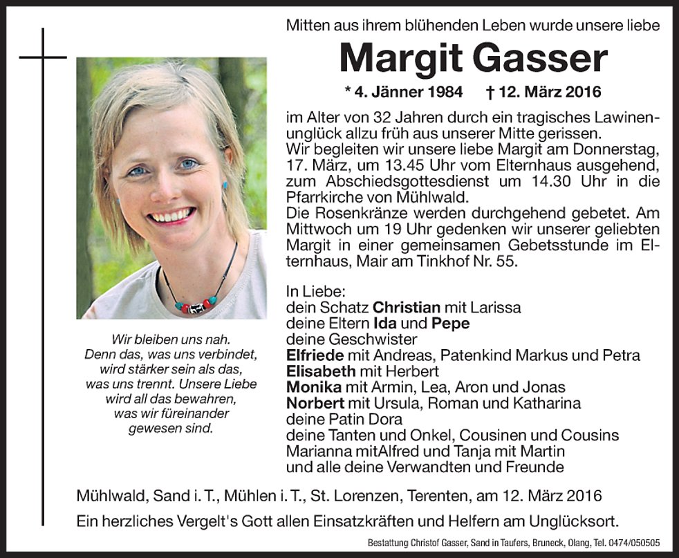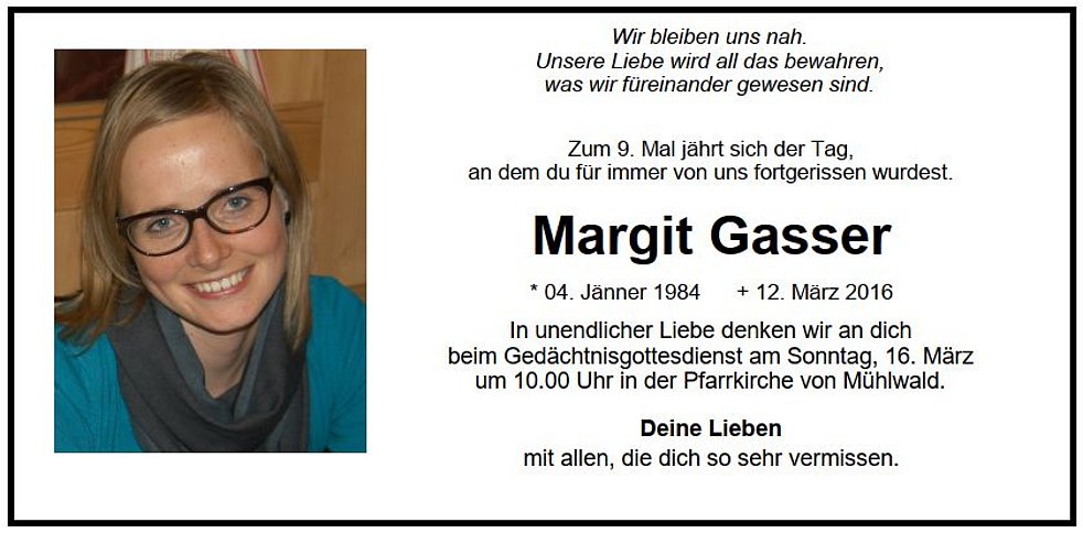 Im Glauben daran, dass Gott sie strahlend empfängt, begleiten wir unsere liebe Margit am Donnerstag, 17. März, um 13.45 Uhr vom Elternhaus ausgehend, zum Abschiedsgottesdienst um 14.30 Uhr in die Pfarrkirche von Mühlwald.