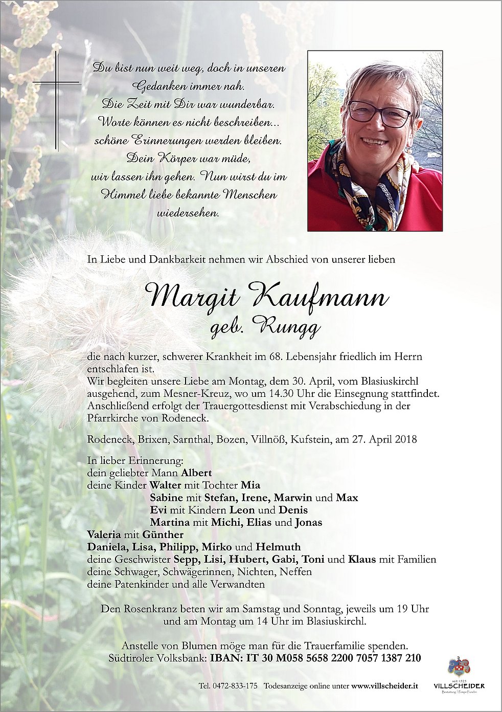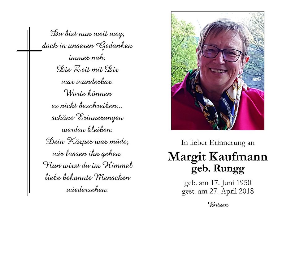 Wir begleiten unsere Liebe am Montag, dem 30. April, vom Blasiuskirchl ausgehend, zum Mesner-Kreuz, wo um 14.30 Uhr die Einsegnung stattfindet. Anschließend erfolgt der Trauergottesdienst mit Verabschiedung in der Pfarrkirche von Rodeneck.