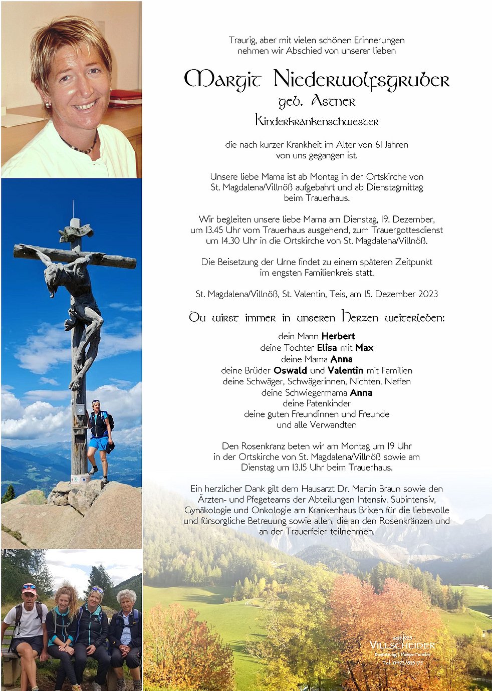 Leb wohl ,liebe Villnößer Margit, wie wir dich immer genannt haben. Dein liebes Wesen, deine Herzlichkeit und deine Lebensfreude werden uns immer in Erinnerung bleiben. Und immer wenn wir von deinem geliebten Meran hinauf zu den Muthöfen wandern, eine Gegend, die du besonders geliebt hast, wirst du uns eine stille und treue Begleiterin sein. Und wir werden dann viel von dir erzählen, wir werden lachen aber wir werden auch weinen. Denn du wirst uns fehlen.