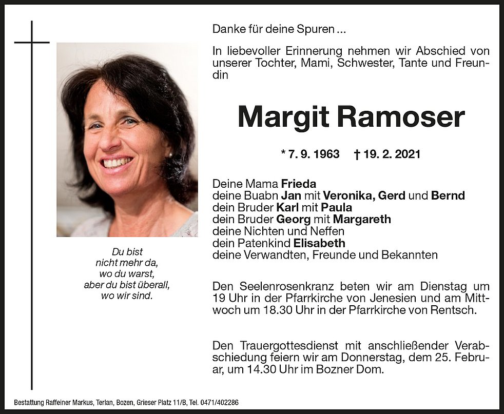Den Trauergottesdienst mit anschließender Verabschiedung feiern wir am Donnerstag, dem 25. Februar, um 14.30 Uhr im Bozner Dom.
