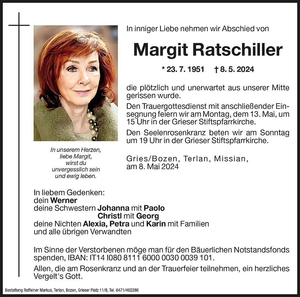 Den Trauergottesdienst mit anschließender Einsegnung feiern wir am Montag, dem 13. Mai, um 15 Uhr in der Grieser Stiftspfarrkirche.