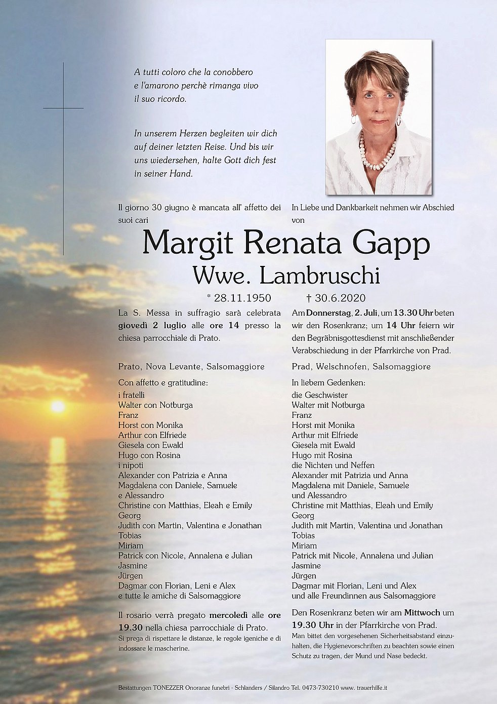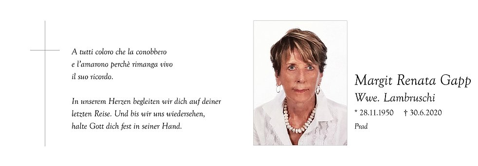 Am Donnerstag, 2. Juli, um 13.30 Uhr beten wir den Rosenkranz; um 14 Uhr feiern wir den Begräbnisgottesdienst mit anschließender Verabschiedung in der Pfarrkirche von Prad.