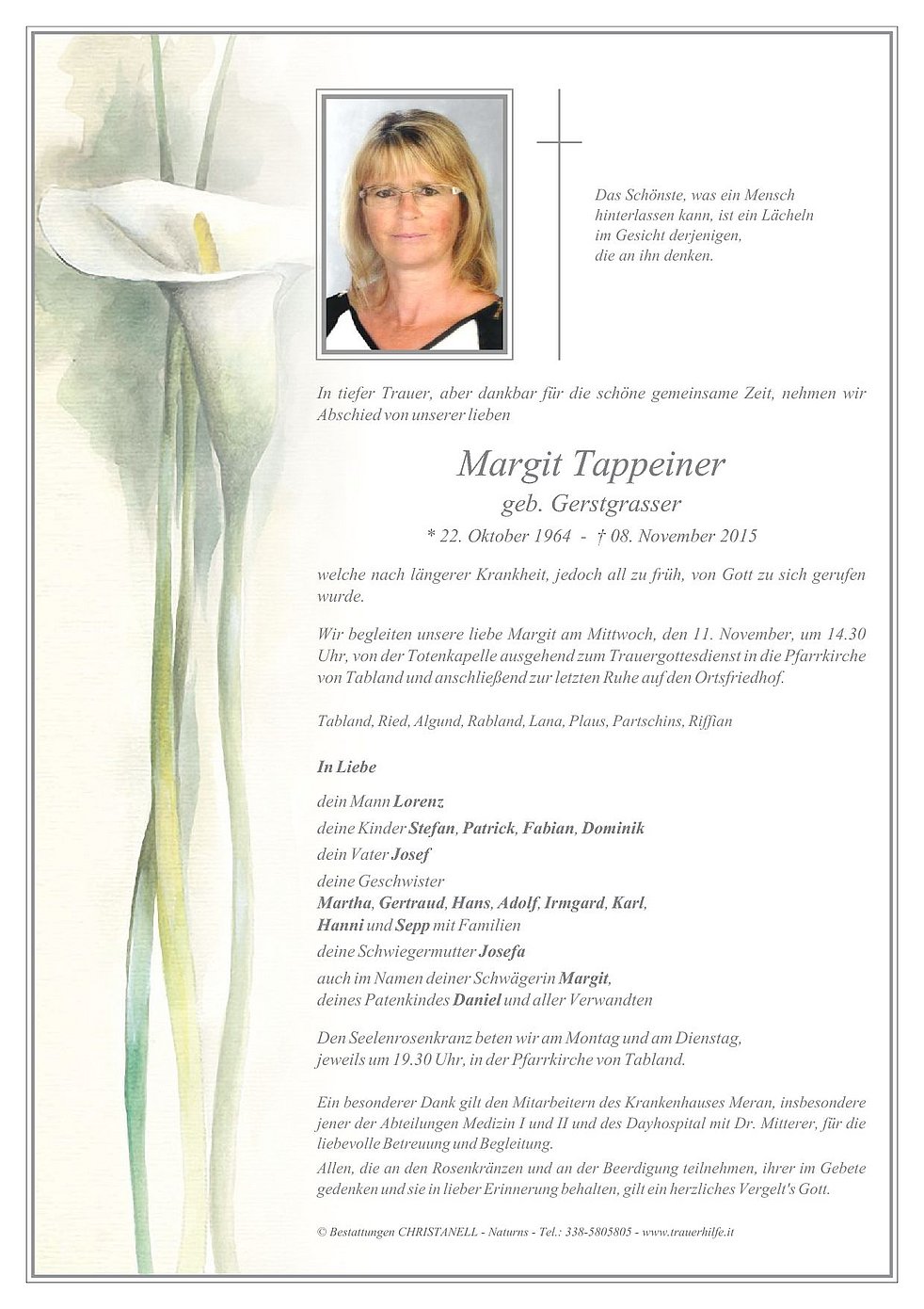 Wir begleiten unsere liebe Margit am Mittwoch, den 11. November, um 14.30 Uhr, von der Totenkapelle ausgehend zum Trauergottesdienst in die Pfarrkirche von Tabland und anschließend zur letzten Ruhe auf den Ortsfriedhof.