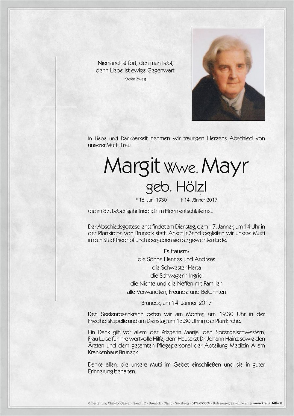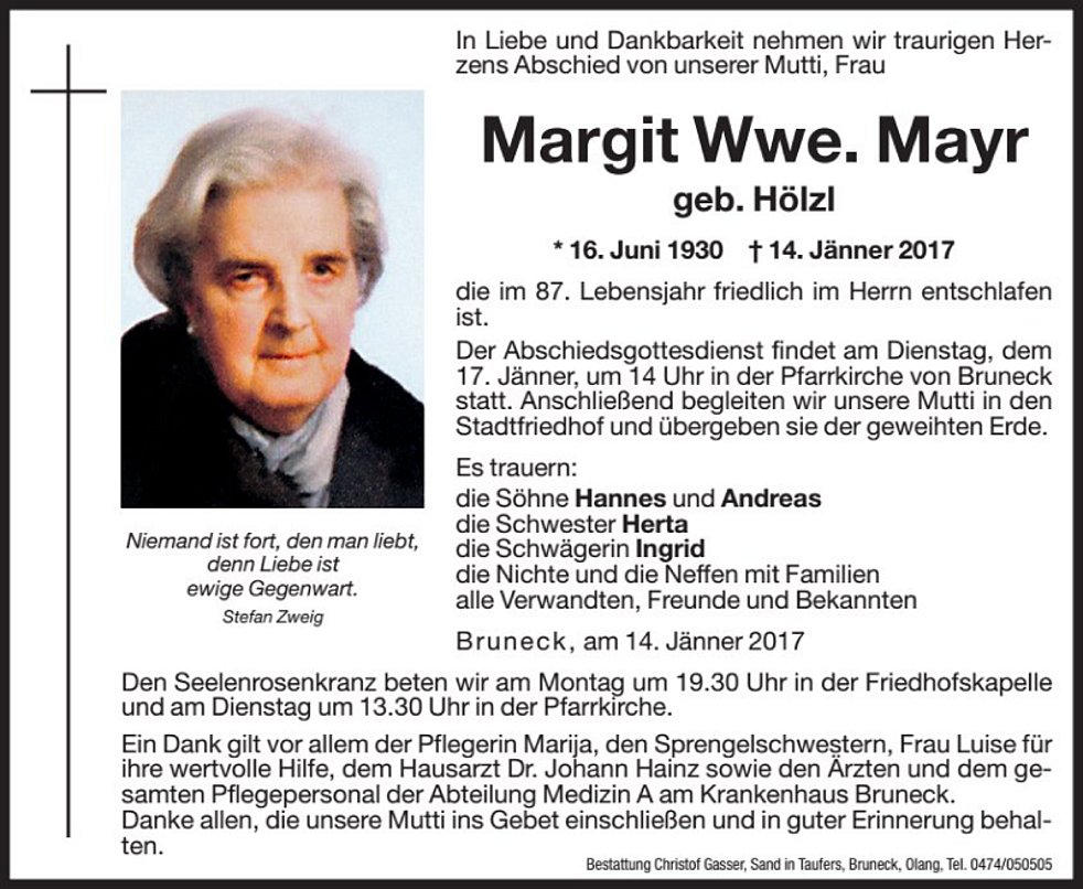 Der Abschiedsgottesdienst findet am Dienstag, dem 17. Jänner, um 14 Uhr in der Pfarrkirche von Bruneck statt. Anschließend begleiten wir unsere Mutti in den Stadtfriedhof und übergeben sie der geweihten Erde.
