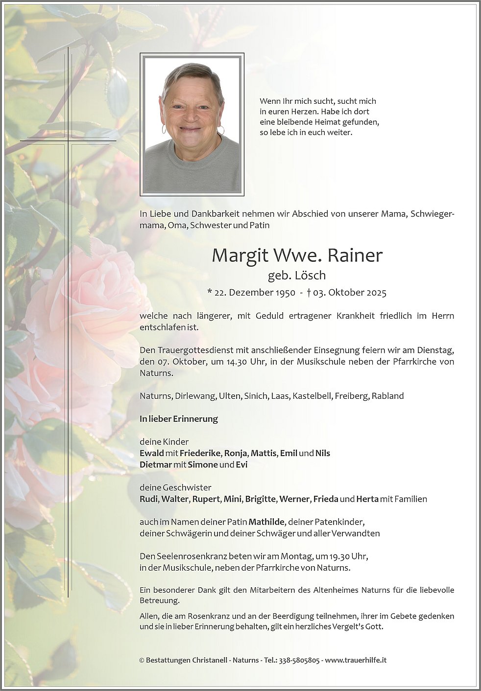 Den Trauergottesdienst mit anschließender Einsegnung feiern wir am Dienstag, den 07. Oktober, um 14.30 Uhr, in der Musikschule neben der Pfarrkirche von Naturns.