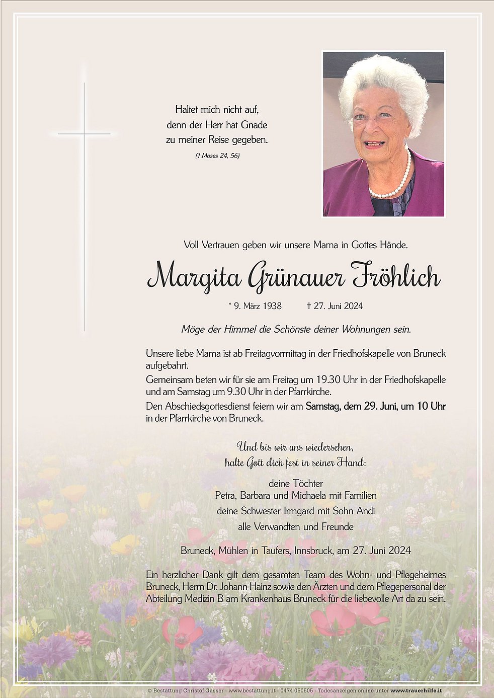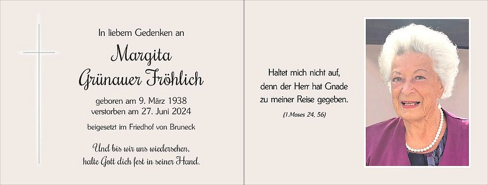 Ein herzlicher Dank gilt dem gesamten Team des Wohn- und Pflegeheimes Bruneck, Herrn Dr. Johann Hainz sowie den Ärzten und dem Pflegepersonal der Abteilung Medizin B am Krankenhaus Bruneck für die liebevolle Art da zu sein.