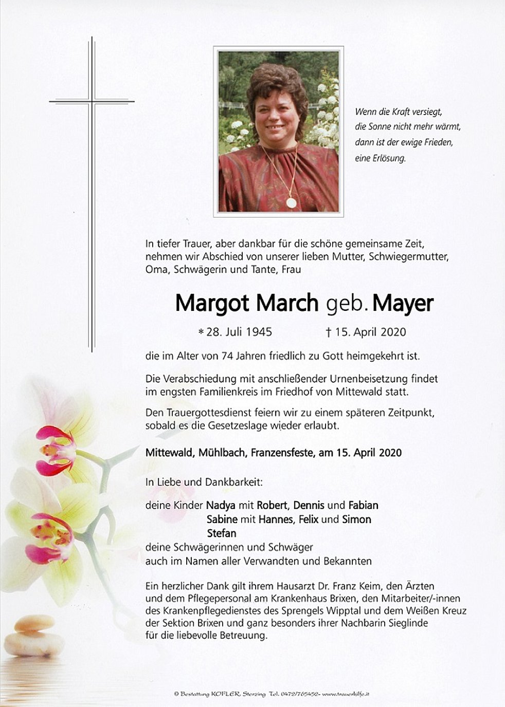 Ein herzlicher Dank gilt ihrem Hausarzt Dr. Franz Keim, den Ärzten und dem Pflegepersonal am Krankenhaus Brixen, den Mitarbeiter/-innen des Krankenpflegedienstes des Sprengels Wipptal und dem Weißen Kreuz der Sektion Brixen und ganz besonders ihrer Nachbarin Sieglinde für die liebevolle Betreuung.