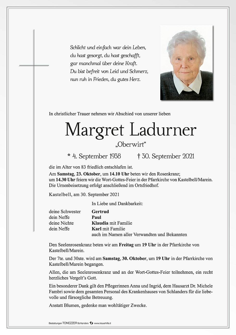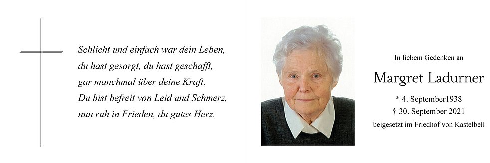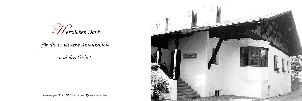 Ein besonderer Dank gilt den Pflegerinnen Anna und Ingrid, dem Hausarzt Dr. Michele Fambri sowie dem gesamten Personal des Krankenhauses von Schlanders für die liebevolle und fürsorgliche Betreuung. Anstatt Blumen, gedenke man wohltätiger Zwecke.