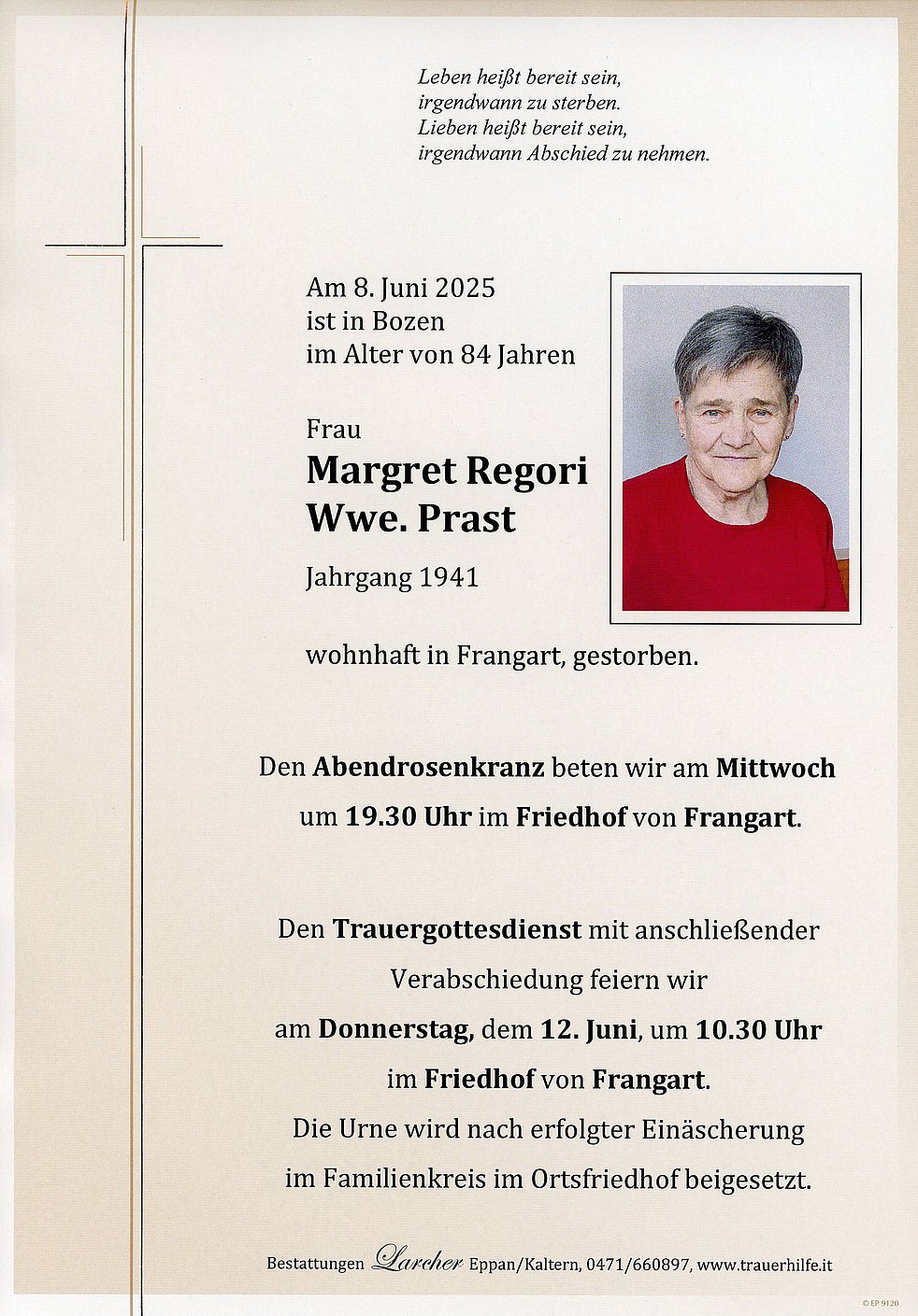 Den Trauergottesdienst mit anschließender Verabschiedung feiern wir am Donnerstag, den 12. Juni um 10.30 Uhr im Friedhof von Frangart.