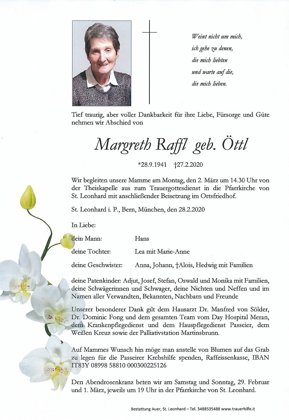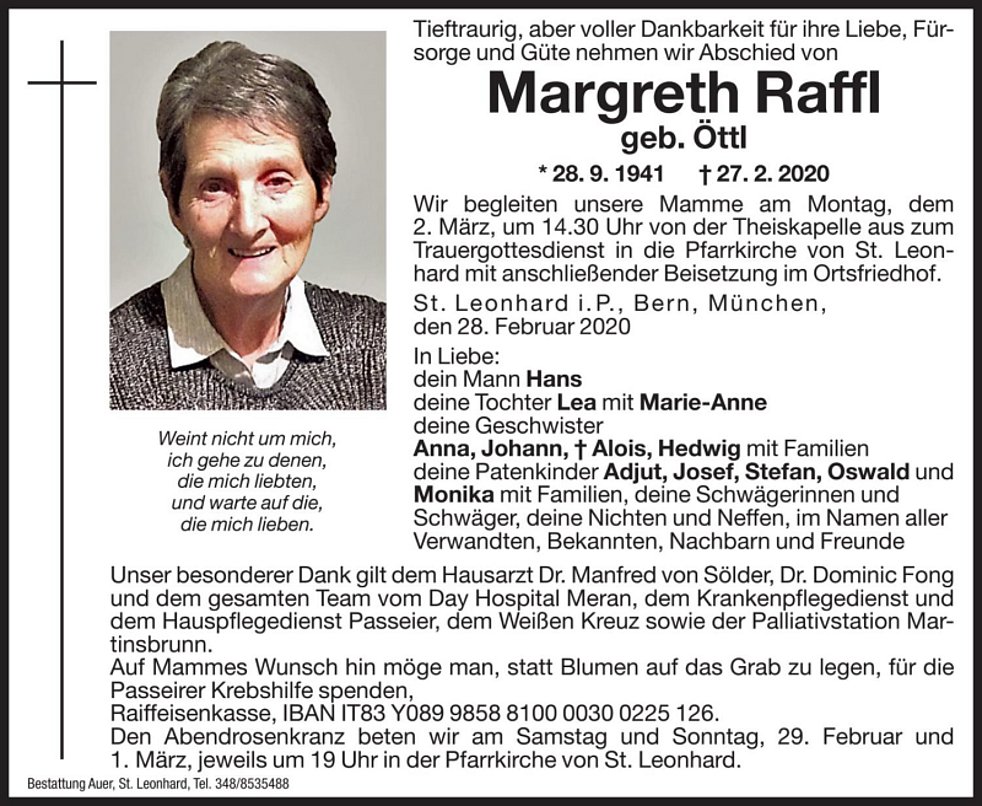 Auf Mammes Wunsch hin möge man anstelle von Blumen auf das Grab zu legen für die Passeirer Krebshilfe spenden, Raffeissenkasse, IBAN IT83Y 08998 58810 000300225126