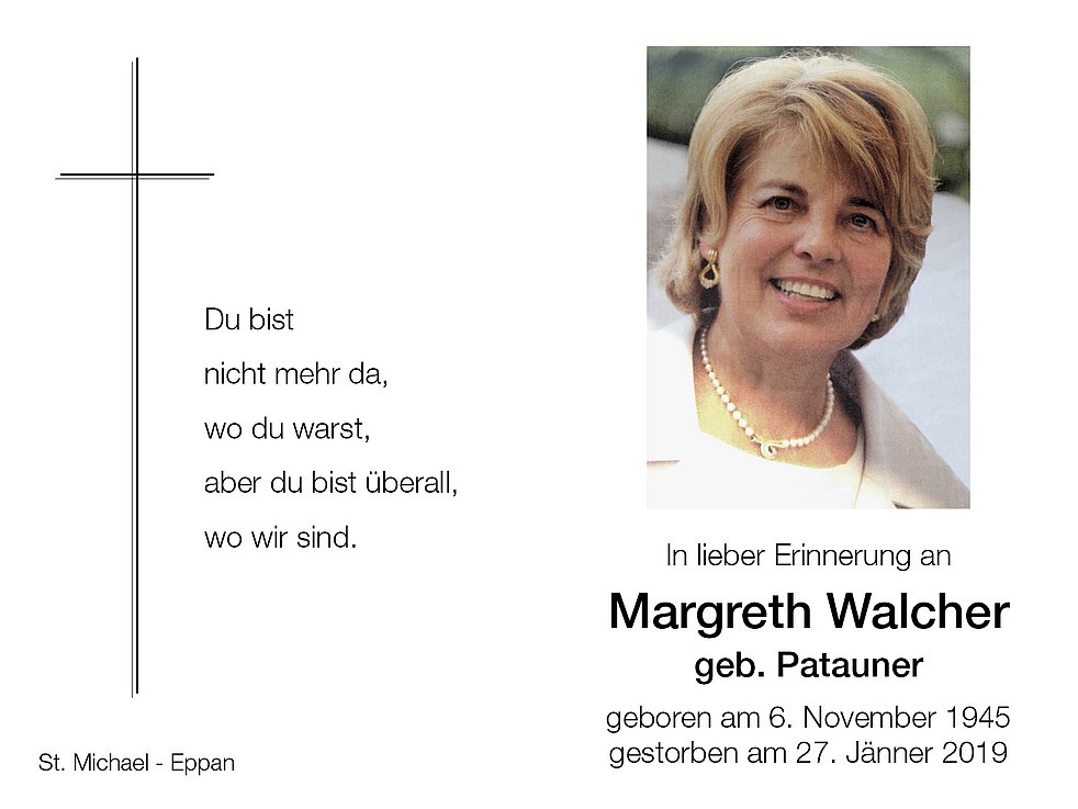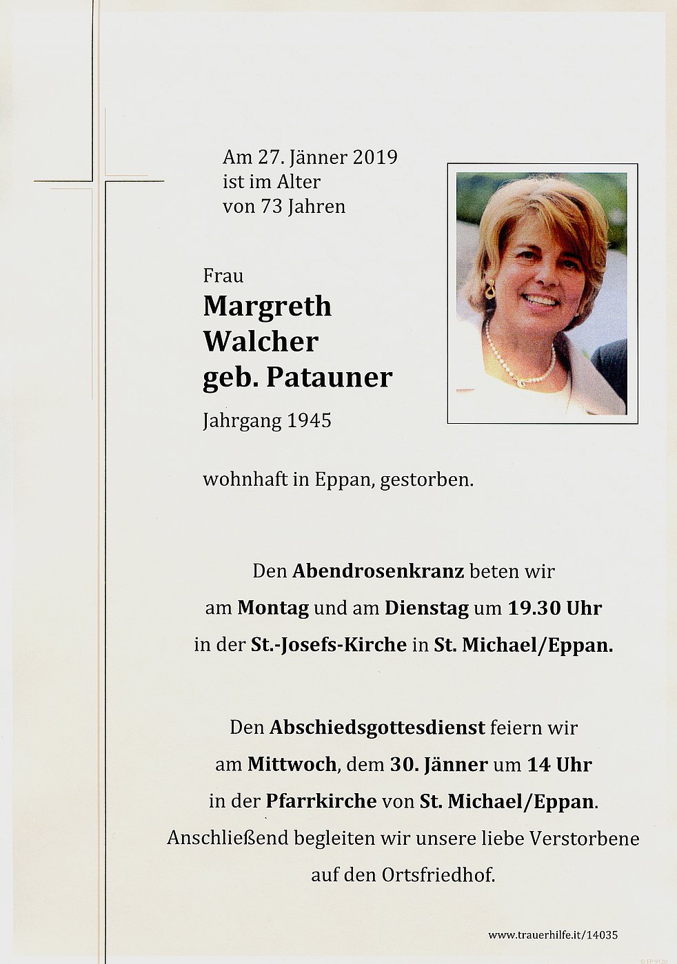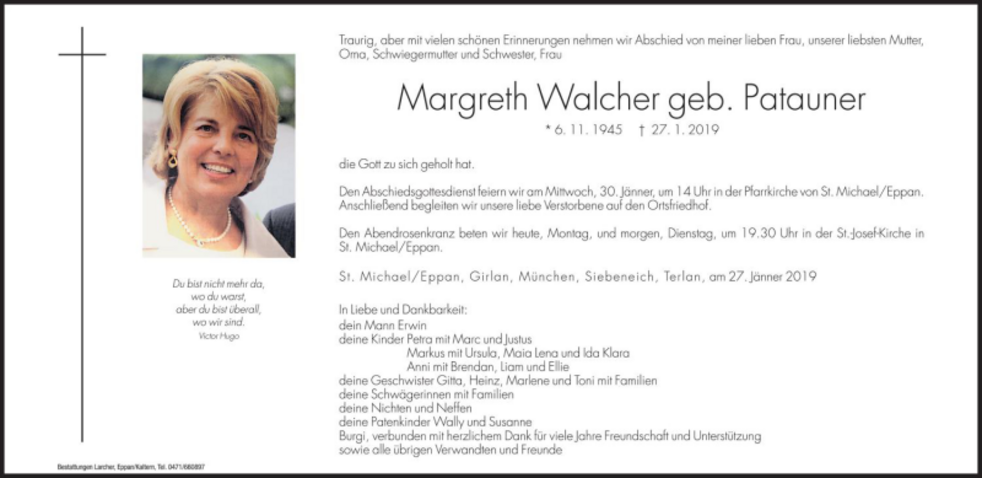 Den Abschiedsgottesdienst feiern wir am Mittwoch 30. Jänner um 14 Uhr in der Pfarrkirche von St. Michael/Eppan. Anschließend begleiten wir unsere liebe Verstorbene auf den Ortsfriedhof.