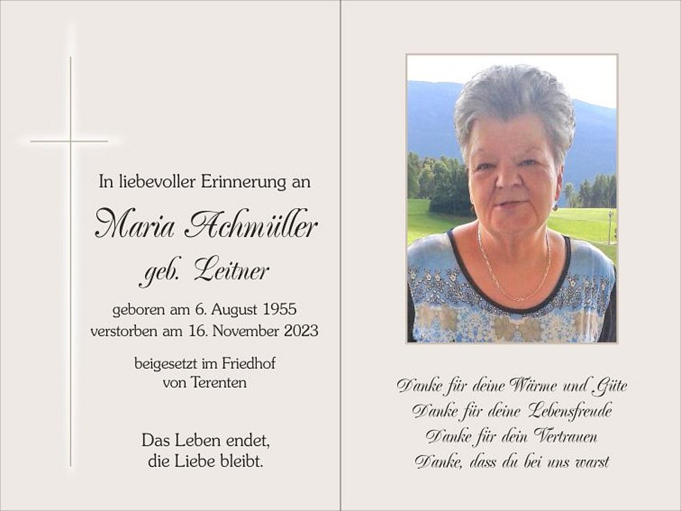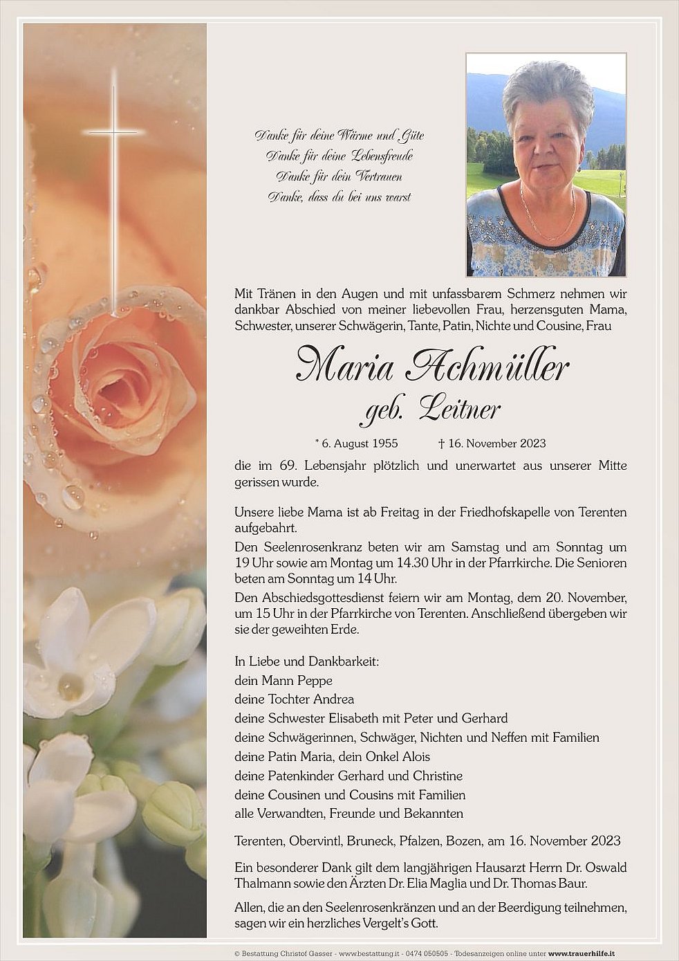 Den Abschiedsgottesdienst feiern wir am Montag, dem 20. November, um 15 Uhr in der Pfarrkirche von Terenten. Anschließend übergeben wir sie der geweihten Erde.