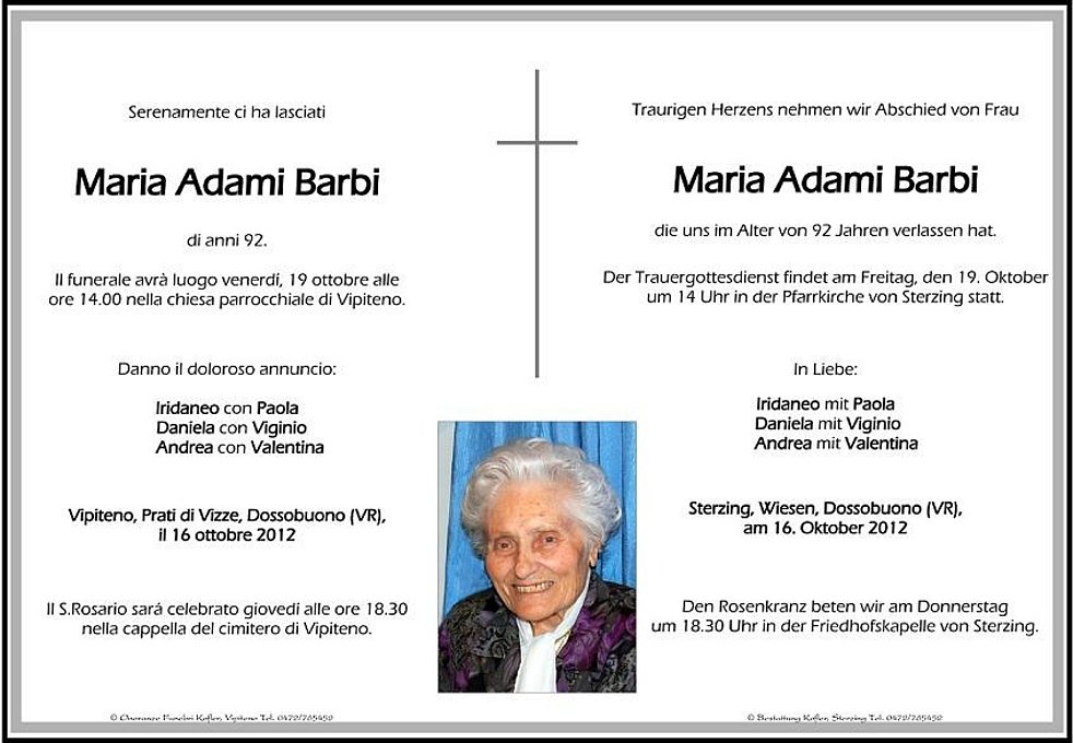 Il S.Rosario sará celebrato giovedí alle ore 18.30 nella cappella del cimitero di Vipiteno.