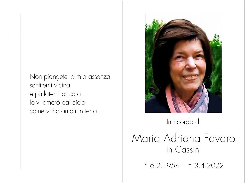 La S. Messa in suffragio verrà celebrata giovedì, 7 aprile alle ore 10.30 nel centro pastorale Corpus Domini in via Gutenberg, indi la nostra cara verrà cremata.