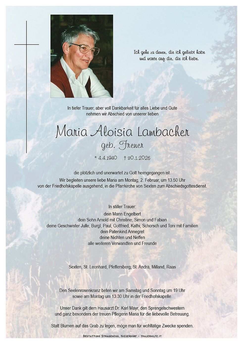 Begräbnisgottesdienst: 02.02. - 14:00 Uhr Sexten