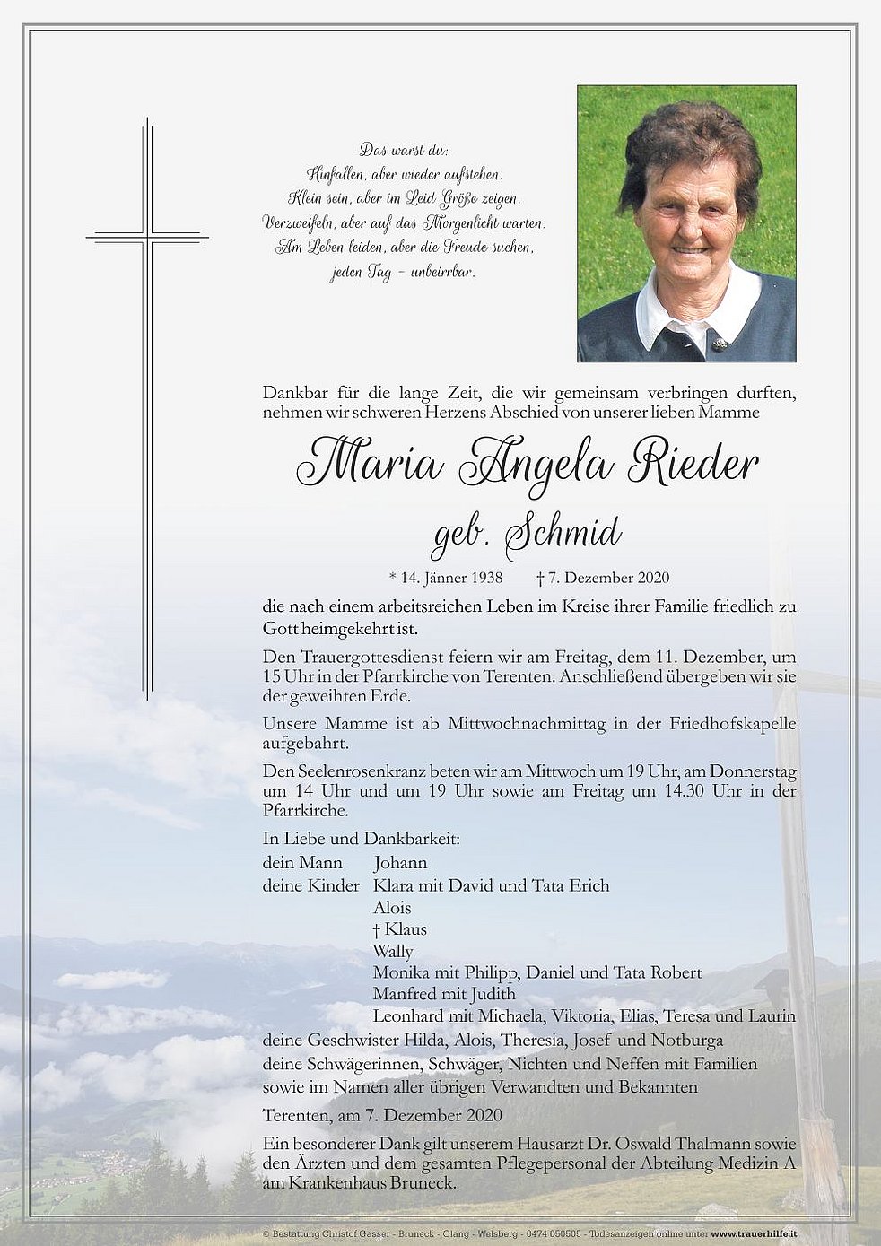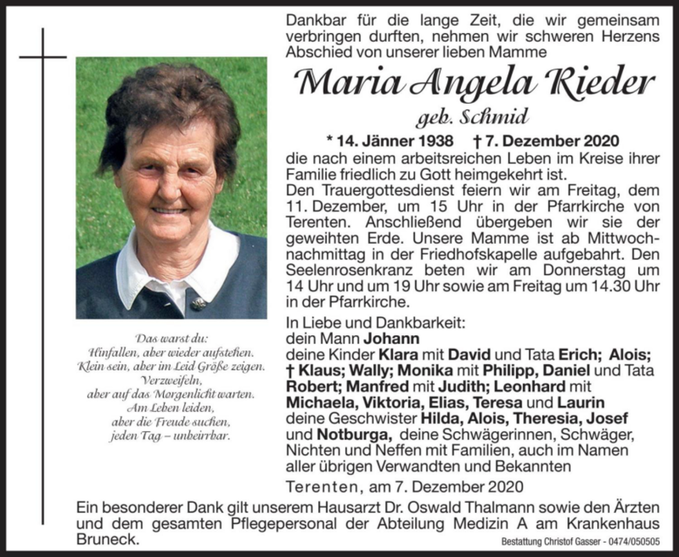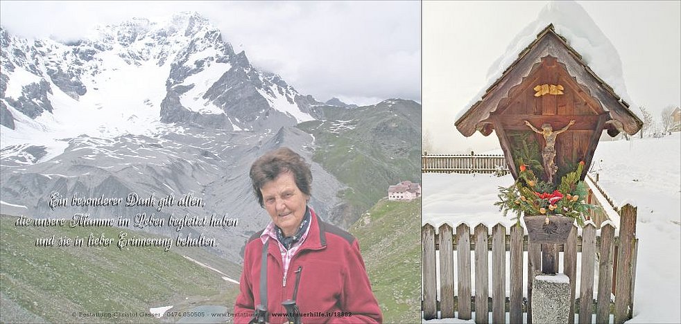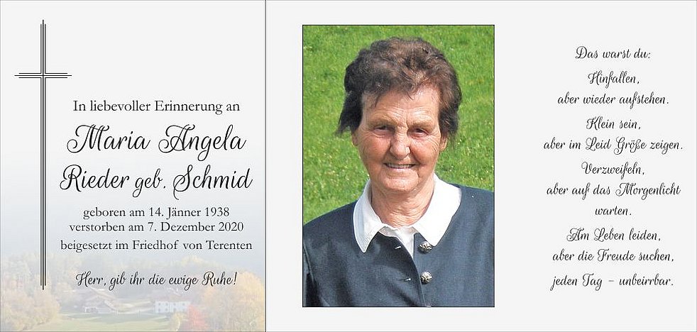 Den Trauergottesdienst feiern wir am Freitag, dem 11. Dezember, um 15 Uhr in der Pfarrkirche von Terenten. Anschließend übergeben wir sie der geweihten Erde.