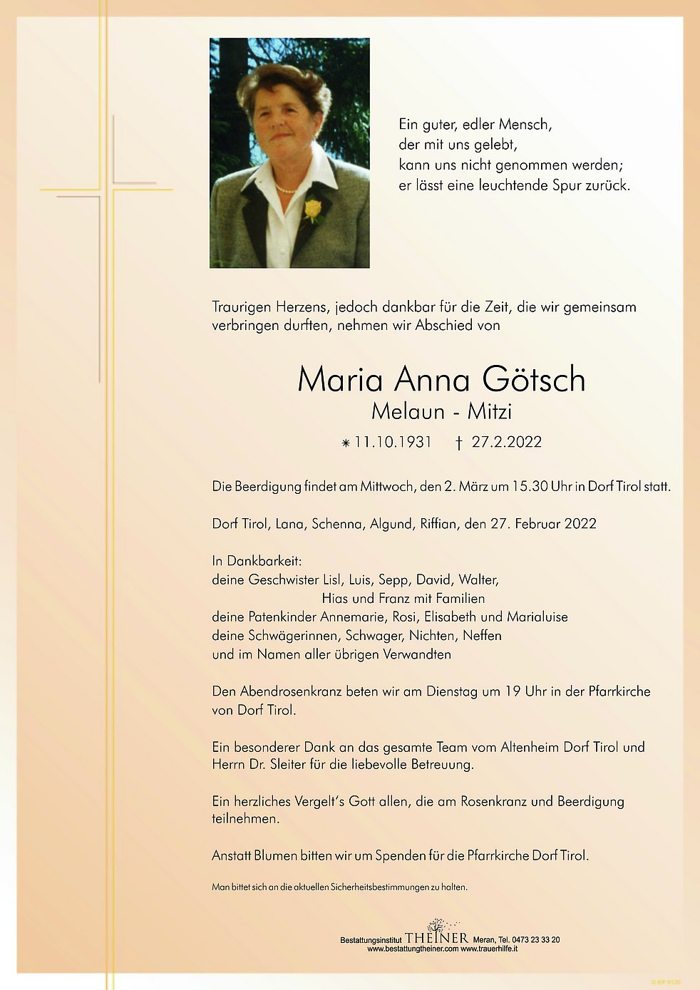 Die Beerdigung findet am Mittwoch, den 2. März um 15.30 Uhr in Dorf Tirol statt.