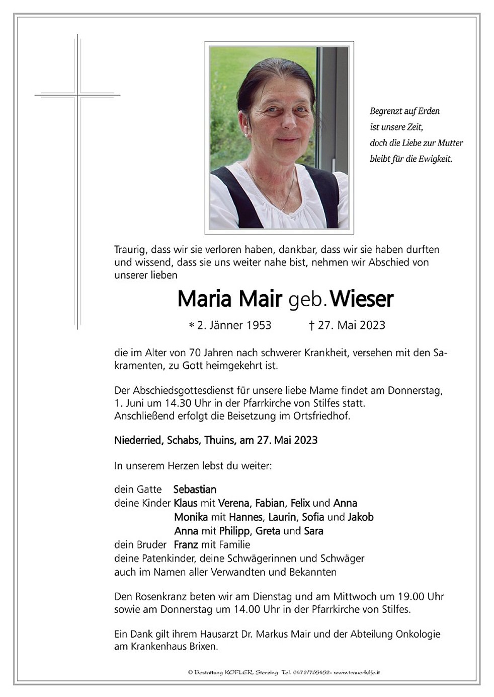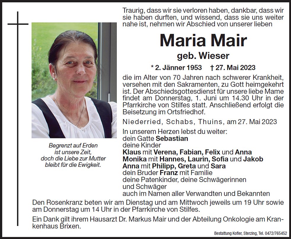 Der Abschiedsgottesdienst für unsere liebe Mame findet am Donnerstag, 1. Juni um 14.30 Uhr in der Pfarrkirche von Stilfes statt.