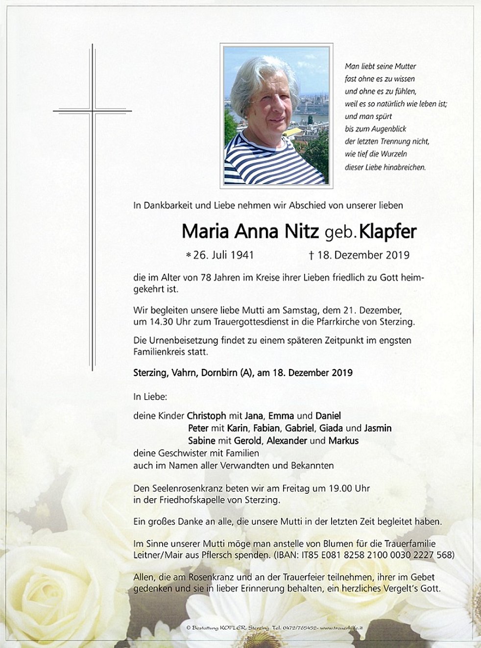 Wir begleiten unsere liebe Mutti am Samstag, dem 21. Dezember, um 14.30 Uhr zum Trauergottesdienst in die Pfarrkirche von Sterzing.