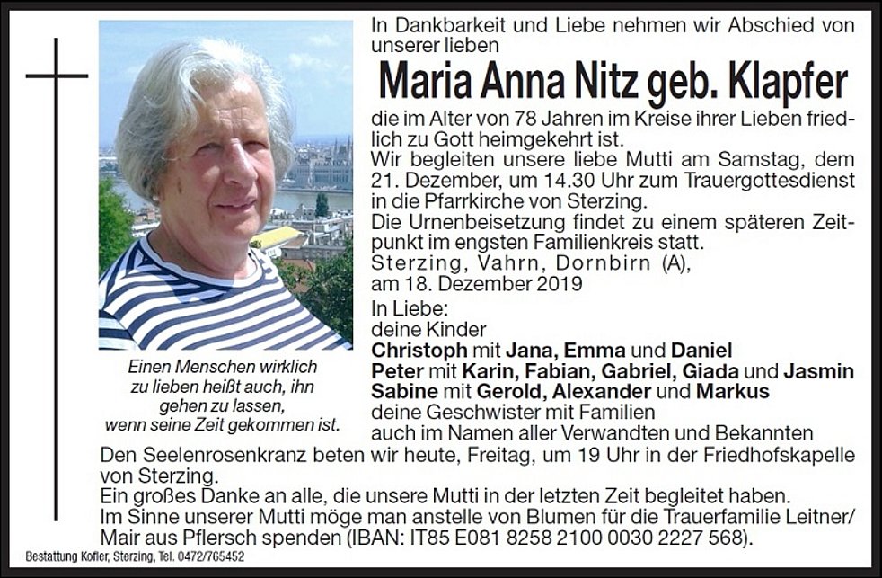 Im Sinne unserer Mutti möge man anstelle von Blumen für die Trauerfamilie Leitner/Mair aus Pflersch spenden. (IBAN: IT85 E081 8258 2100 0030 2227 568)