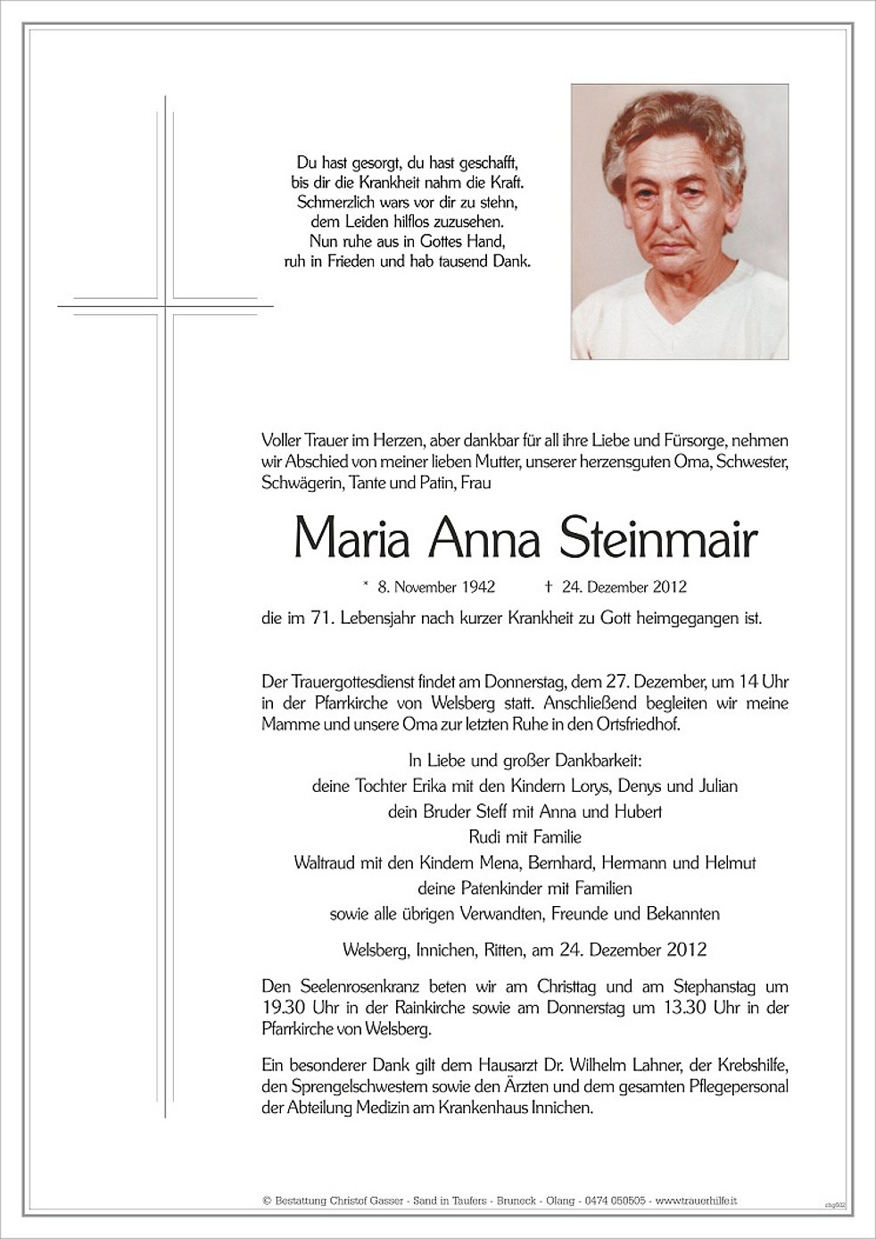 Der Trauergottesdienst findet am Donnerstag, dem 27. Dezember, um 14 Uhr in der Pfarrkirche von Welsberg statt. Anschließend begleiten wir meine Mamme und unsere Oma zur letzten Ruhe in den Ortsfriedhof.