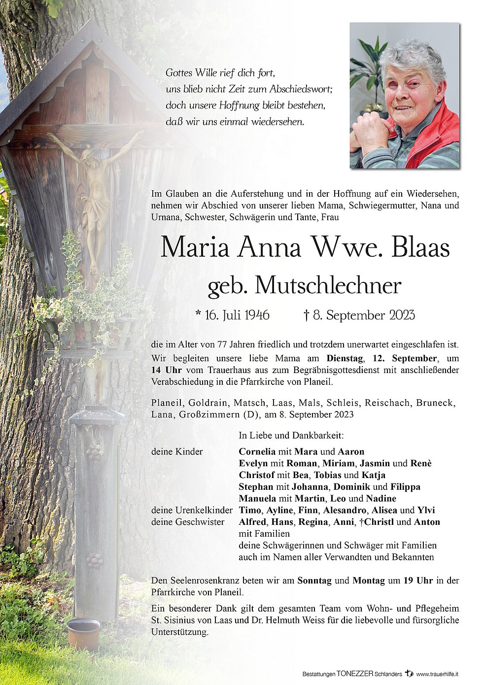 Im Glauben an die Auferstehung und in der Hoffnung auf ein Wiedersehen, nehmen wir Abschied von unserer lieben Mama, Schwiegermutter, Nana und Urnana, Schwester, Schwägerin und Tante, Frau