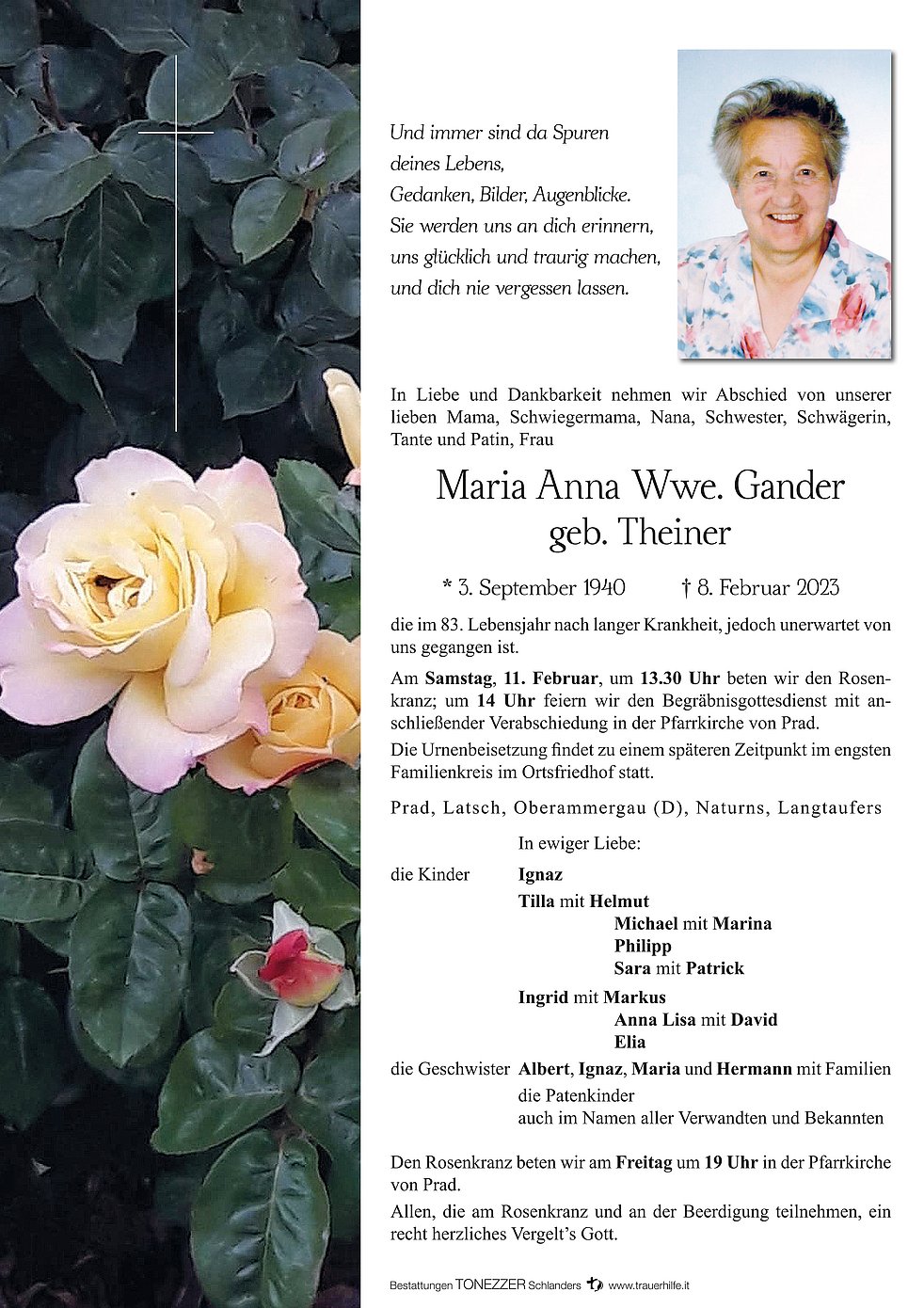 Am Samstag, 11. Februar, um 13.30 Uhr beten wir den Rosenkranz; um 14 Uhr feiern wir den Begräbnisgottesdienst mit anschließender Verabschiedung in der Pfarrkirche von Prad.