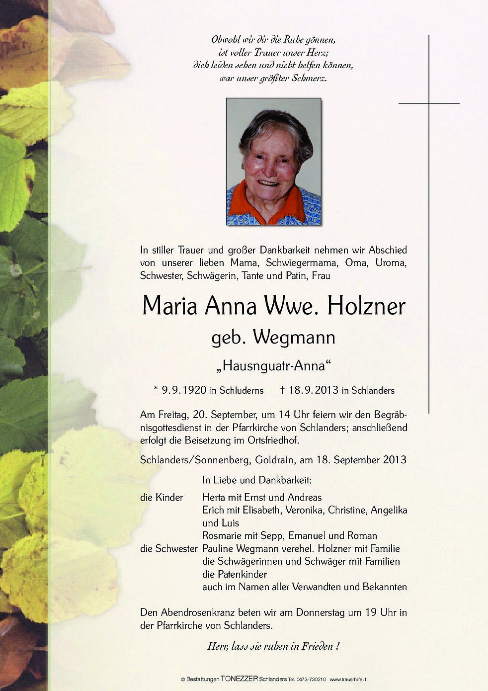 Am Freitag, 20. September, um 14 Uhr feiern wir den Begräbnisgottesdienst in der Pfarrkirche von Schlanders; anschließend erfolgt die Beisetzung im Ortsfriedhof.