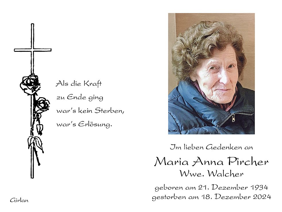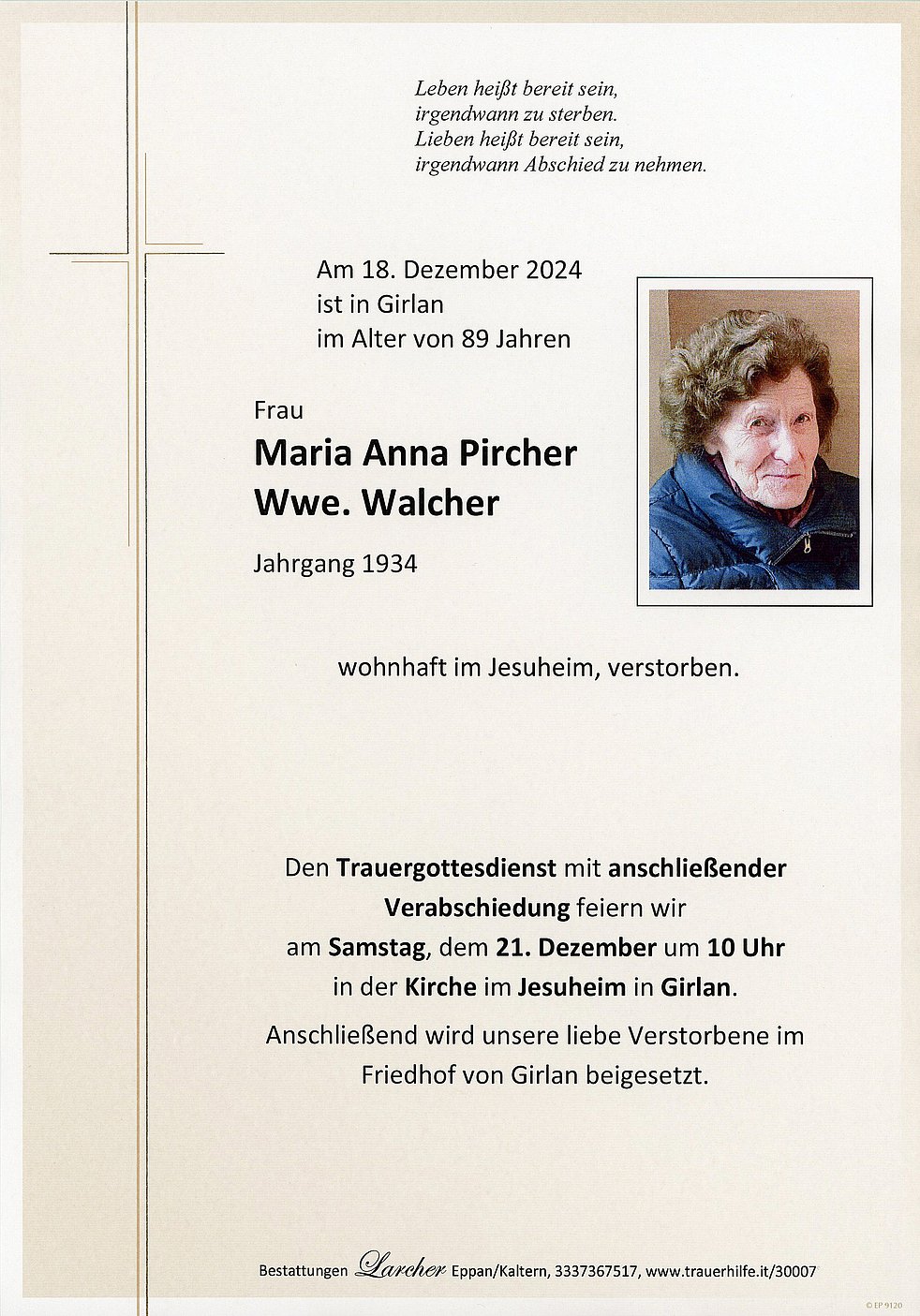 Den Trauergottesdienst mit anschließender Verabschiedung feiern wir am Samstag, dem 21. Dezember um 10 Uhr in der Kirche im Jesuheim Girlan. Anschließend wird unsere liebe Verstorbene im Friedhof Girlan beigesetzt.