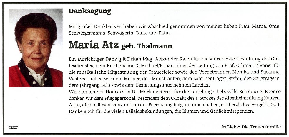 Wir danken der Hausärztin Dr. Marlene Resch für die jahrelange, liebevolle Betreuung und dem Pflegepersonal, besonders dem Wohnbereich C-Trakt der Altenheimstiftung Kaltern.