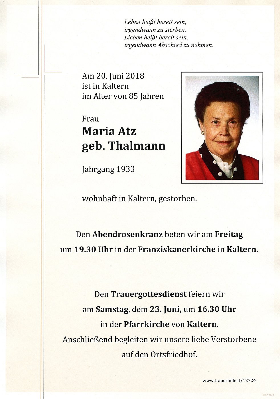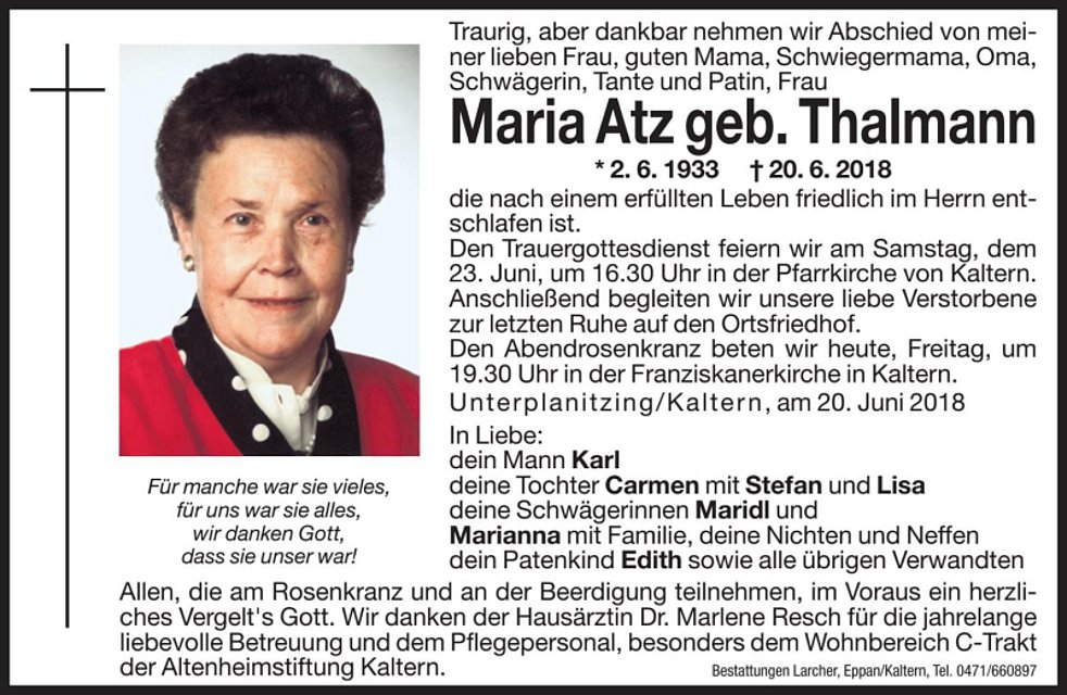 Den Trauergottesdienst feiern wir am Samstag, dem 23. Juni um 16.30 Uhr in der Pfarrkirche von Kaltern. Anschließend begleiten wir unsere liebe Verstorbene zur letzten Ruhe auf den Ortsfriedhof.