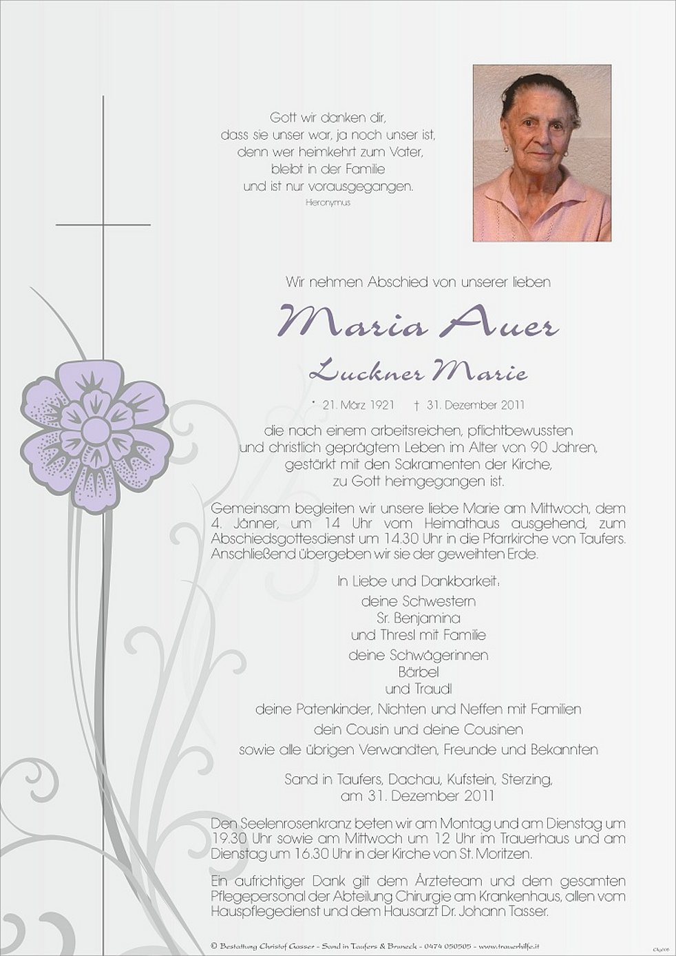 Gemeinsam begleiten wir unsere liebe Marie am Mittwoch, dem 4. Jänner, um 14 Uhr vom Heimathaus ausgehend, zum Abschiedsgottesdienst um 14.30 Uhr in die Pfarrkirche von Taufers. Anschließend übergeben wir sie der geweihten Erde.