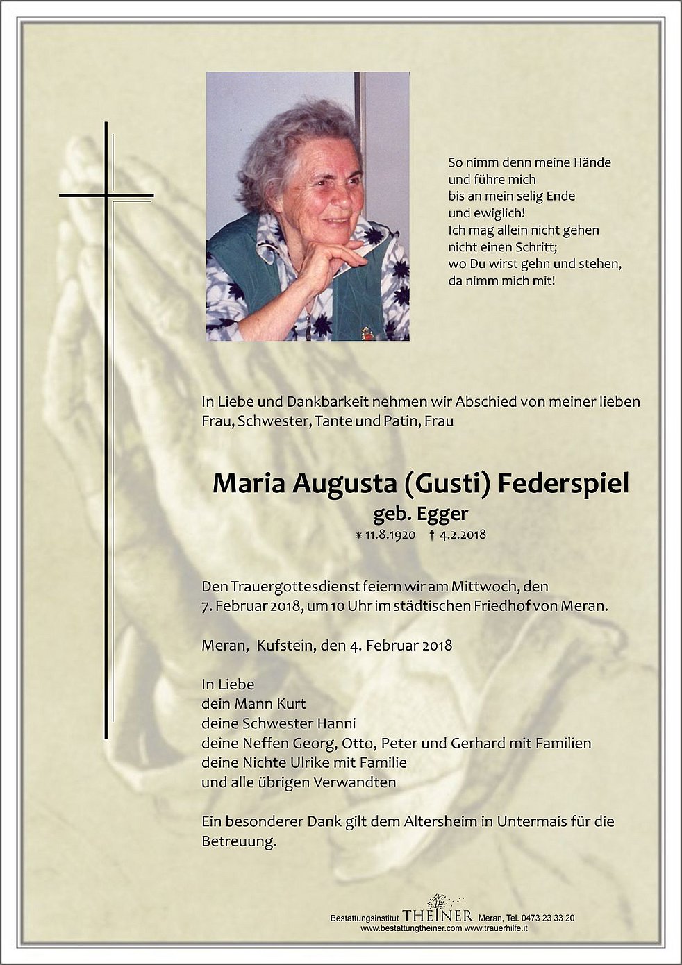 Den Trauergottesdienst feiern wir am Mittwoch, den 7. Februar 2018, um 10 Uhr im städtischen Friedhof von Meran.
