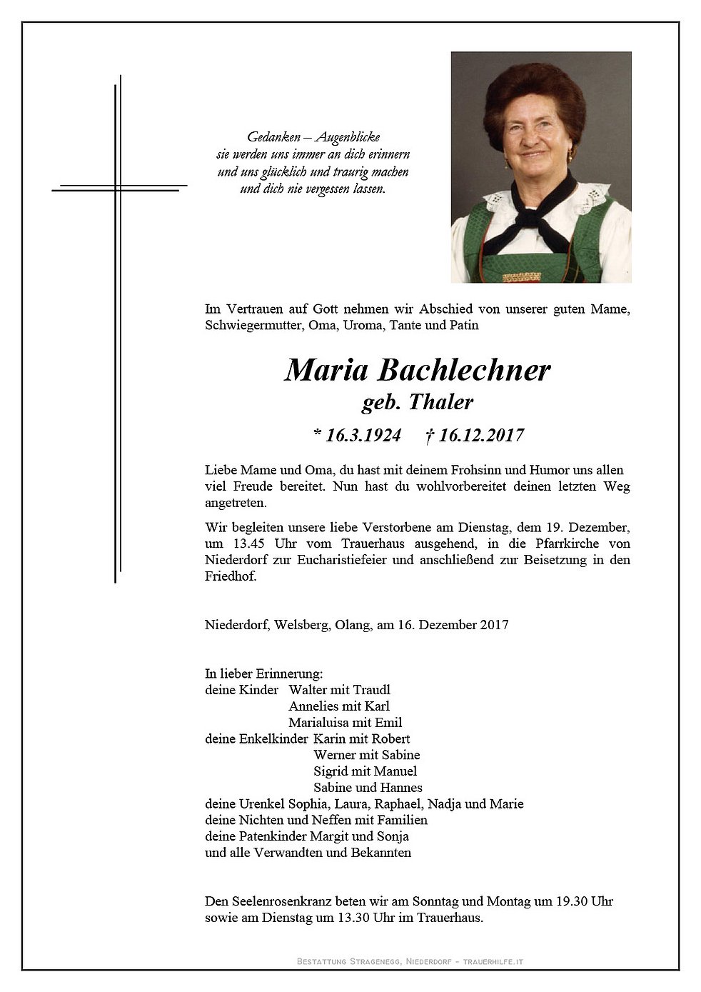 Wir begleiten unsere liebe Verstorbene am Dienstag, dem 19. Dezember, um 13.45 Uhr vom Trauerhaus ausgehend, in die Pfarrkirche von Niederdorf zur Eucharistiefeier und anschließend zur Beisetzung in den Friedhof.