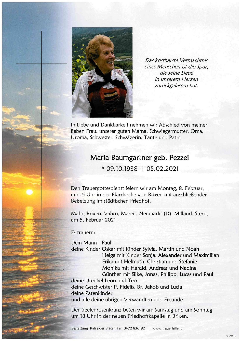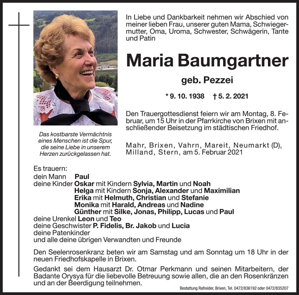 Den Trauergottesdienst feiern wir am Montag, 8. Februar, um 15 Uhr in der Pfarrkirche von Brixen mit anschließender Beisetzung im städtischen Friedhof.