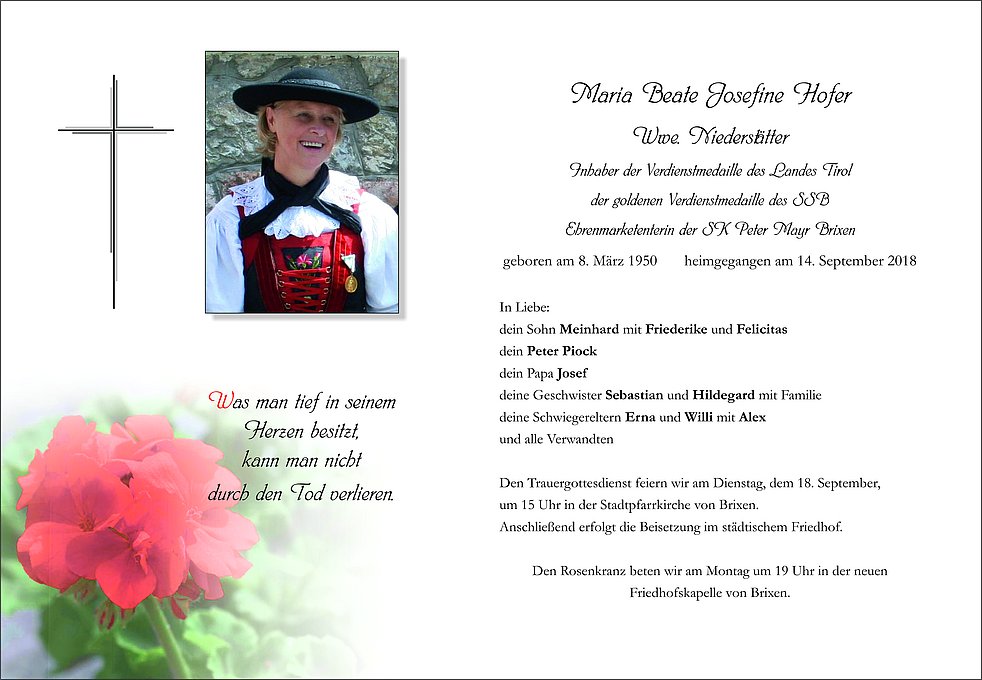 Den Trauergottesdienst feiern wir am Dienstag, dem 18. September,