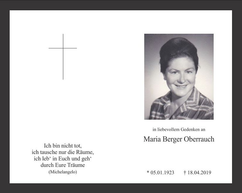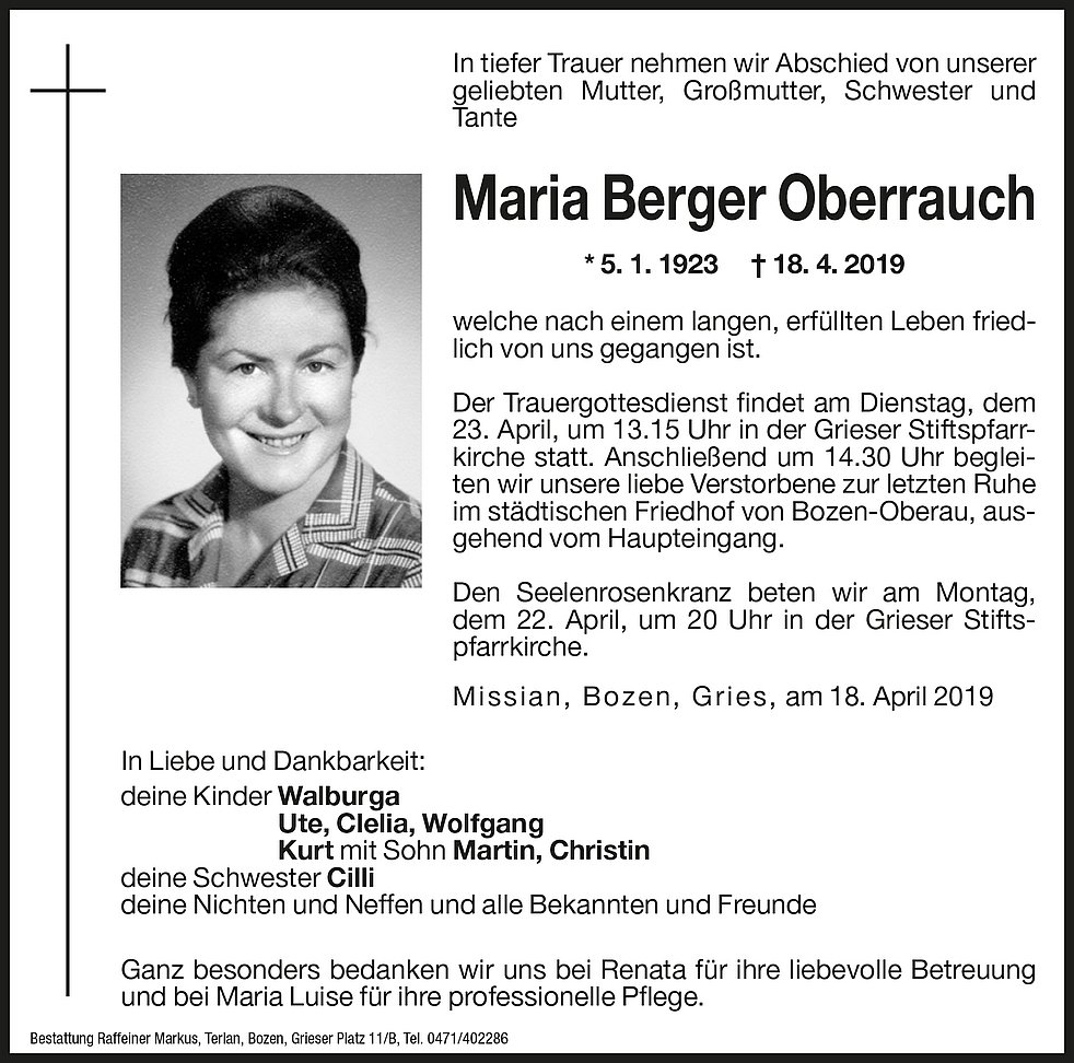 Der Trauergottesdienst feiern am Dienstag, den 23. April, um 13.15 Uhr in der Grieser Stiftspfarrkirche statt. Anschlieβend um 14.30 Uhr begleiten wir unsere liebe Verstorbene zur letzten Ruhe im städtischen Friedhof von Bozen-Oberau, ausgehend vom Haupteingang.