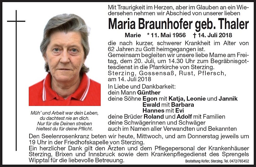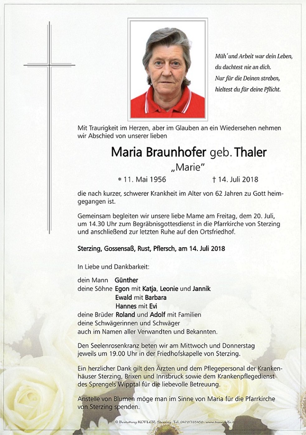 Gemeinsam begleiten wir unsere liebe Mame am Freitag, dem 20. Juli, um 14.30 Uhr zum Begräbnisgottesdienst in die Pfarrkirche von Sterzing und anschließend zur letzten Ruhe auf den Ortsfriedhof.