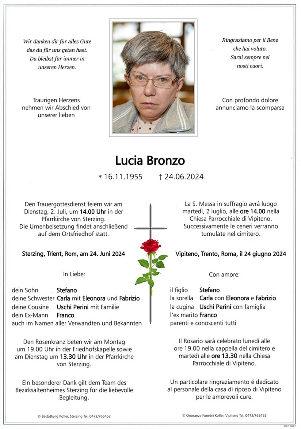 La S. Messa in suffragio avrá luogo martedì, 2 luglio, alle ore 14.00 nella Chiesa Parrocchiale di Vipiteno.Successivamente le ceneri verranno tumulate nel cimitero.