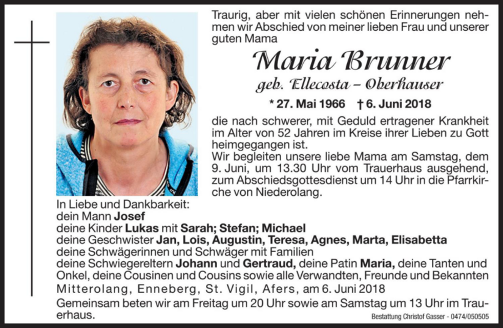 Wir begleiten unsere liebe Mama am Samstag, dem 9. Juni, um 13.30 Uhr vom Trauerhaus ausgehend, zum Abschiedsgottesdienst um 14 Uhr in die Pfarrkirche von Niederolang.